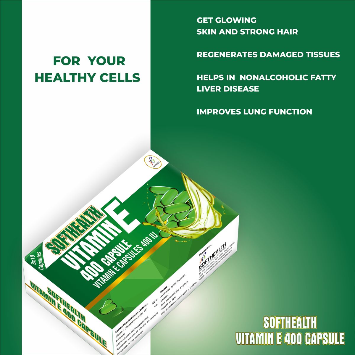 Vitamin E 400IU Description: Vitamin E is a fat-soluble vitamin. Vitamin E acts as an antioxidant with anti-inflammatory properties. Vitamin E helps to nourish and protects from skin damage caused by free radicals. Vitamin E may also reduce the heart disease risk, eyesight problems, and brain disorders. Vitamin E has antioxidant properties that help to protect cell damage caused by external factors like pollution, harsh weather, smoking, and prevents wrinkle formation. Vitamin E helps in non-alcoholic fatty liver disease. Vitamin E may improve liver function. Vitamin E also helps in strong muscle development. Vitamin E is a natural skin lightening product that reduces melanin production and improves skin tone, texture, sensitivity, and reduces uneven skin colour. Vitamin E also improves skin, wound healing and burns by repairing and regenerating the damaged tissues of skin.