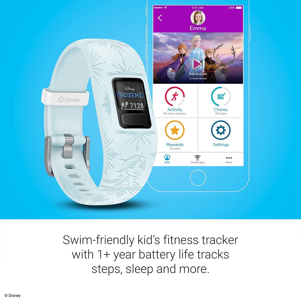 Vivofit® jr. 2 isn't just a fitness tracker for kids. It's an interactive experience where activity unlocks adventure. The swim-friendly band features more than a year of battery -no recharging necessary. With the vivofit jr. 2 kids can uncover exciting Disney's Frozen 2 adventures and games on the parent-controlled app by completing 60 minutes of daily activity. Parents can use the app to access chore and reward management tools.