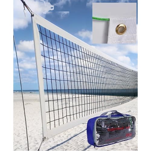 PROFESSIONAL VOLLEYBALL NET OUTDOOR HEAVY DUTY comes with 40 feet aircraft steel cable (2.5mm thickness) on the top, which is easy to secure the volleyball net on volleyball courts, other poles or trees. (POLES NOT INCLUDED). Net size is 32 x 3 FT, same as official size of Olympic. Four corners have grommets and included 6.6 feet ropes (3mm thickness). All features allow you to have a straight yet sturdy net to play volleyball or badminton. volleyball net for the pool