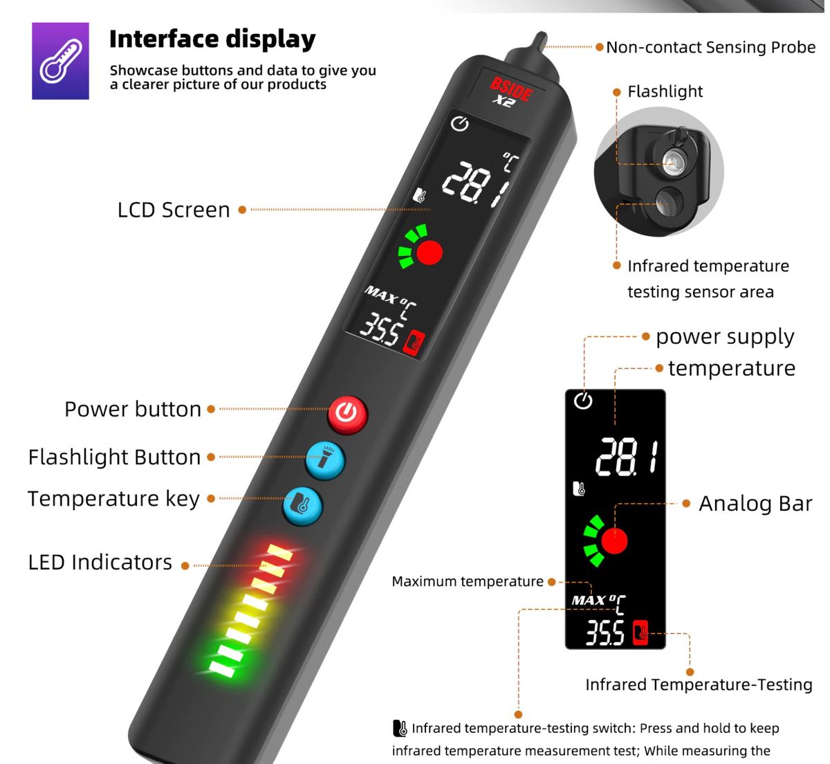 The voltage detector integrated infrared thermometer greatly enhances the testing experience, which is very suitable for HVAC applications, automobiles, grills, etc.