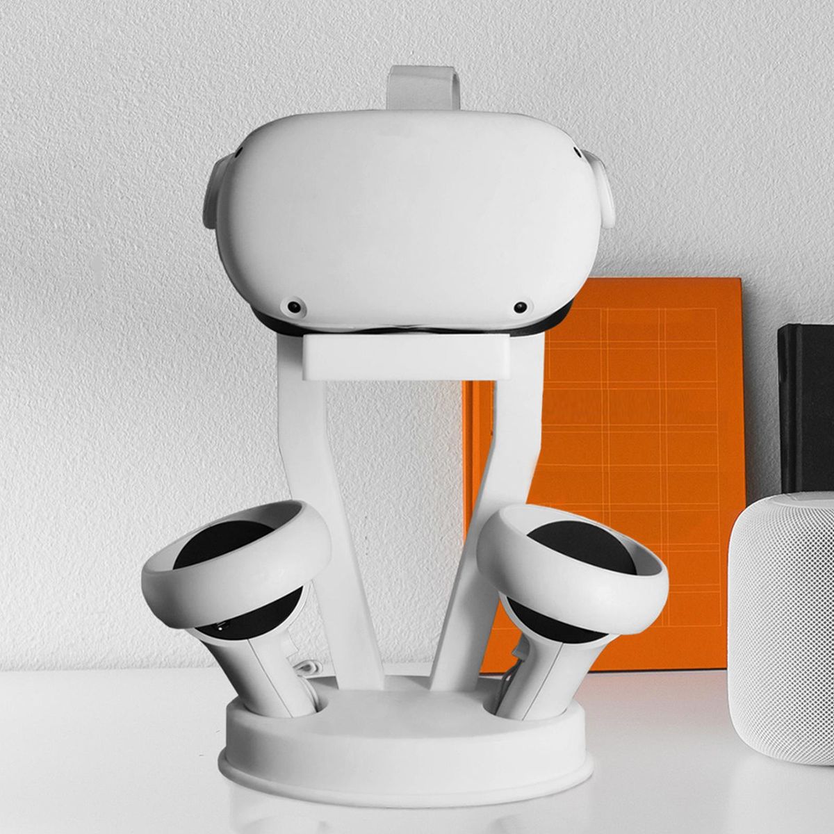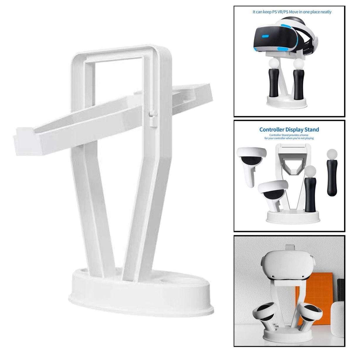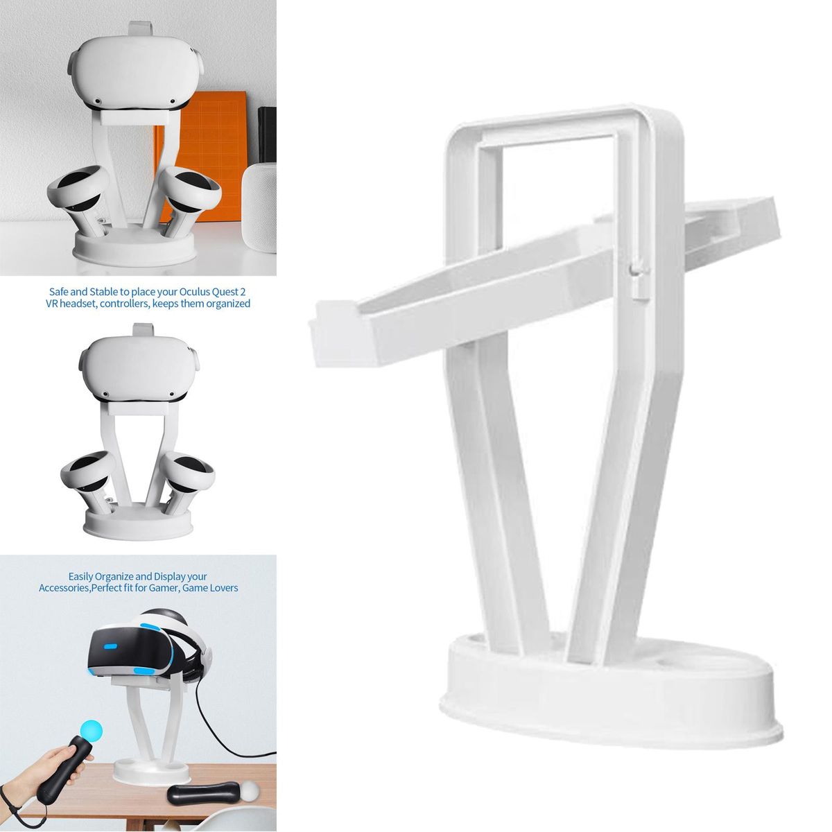 Suitable for Quest 2 / PS VR.Hard ABS plastic material, stable installation, not easy to shake, durable and reliable.It can store 1 VR headset and 2 VR controllers at the same time, space-saving and organized.Stylish design to compliment your VR headset and accessories.Easy to assemble and store, pushing the release button to use or store.