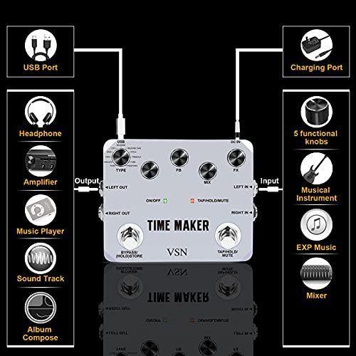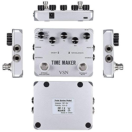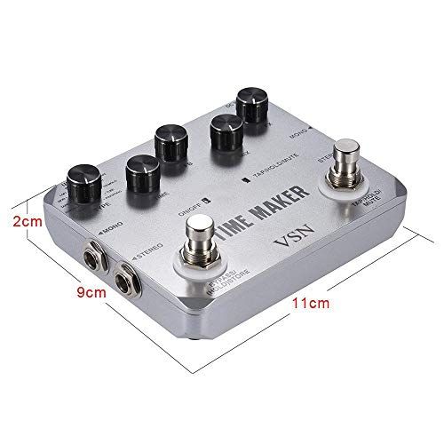 Details: Produt desription The VSN Time Maker pedal uses floating-point DSP hips, with new Algorithms, therefore the tone is signifiantly improved. The Time Maker embles 11 delay effets with Tap Tempo funtion whih makes adjusting the delay time muh more Easier. From lean"Pure"delay to psyhedeli "Reverse Tape" Delay, we enhane different musial styles with different delay hoies. Three additional effets whih an be added to the delay effets. Ultimate Delay has separated dry and wet level ontrol. Its also equipped with high ut and low ut ontrol, Stereo input and stereo output, preset saving funtion. Whether used for pratiing or professional performane, Time Maker will give you muh more inspetion for your playing. You an find what you need with the delay tone Maximun 4s delay time, all the delay time your playing ould ever need Time(Delay Time), FB(Feedbak),Mix and Fix-for total ontrol of your delay sound USB interfae for output or input files, and system upgrade. Speifiations Input: Two 1/4 Jaks (Impedane: 4k Ohms) Output: Two 1/4 Jaks (Impedane: Ohms) Sampling Rate: 44.1K Sampling Auray: 24bit 105 dB Dynami Range Working urrent: 1 mA Power Supply: 9V AC adapter (positive Tip) Dimensions: 116mm (D)*mm (W)*35mm (H) Weight: 5g (with box) Whole Aluminium-alloy li, stable and strong. PreautionsDo not use the pedal in high temperature, high humidity, or subzero environments.Do not use the pedal in the diret sunlight. Please do not dissemble the pedal by yourself. Please keep the manual for future referene. Pakage inluded 1 x VSN Time Maker Guitar Effet Pedal 1 x Users Manual