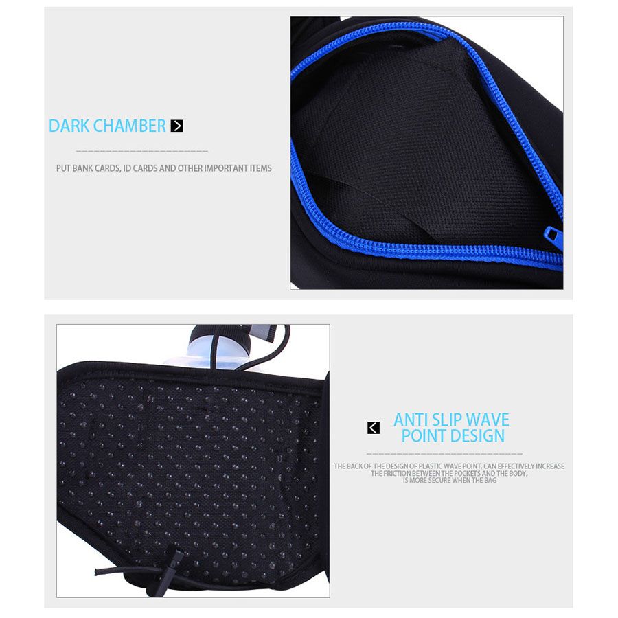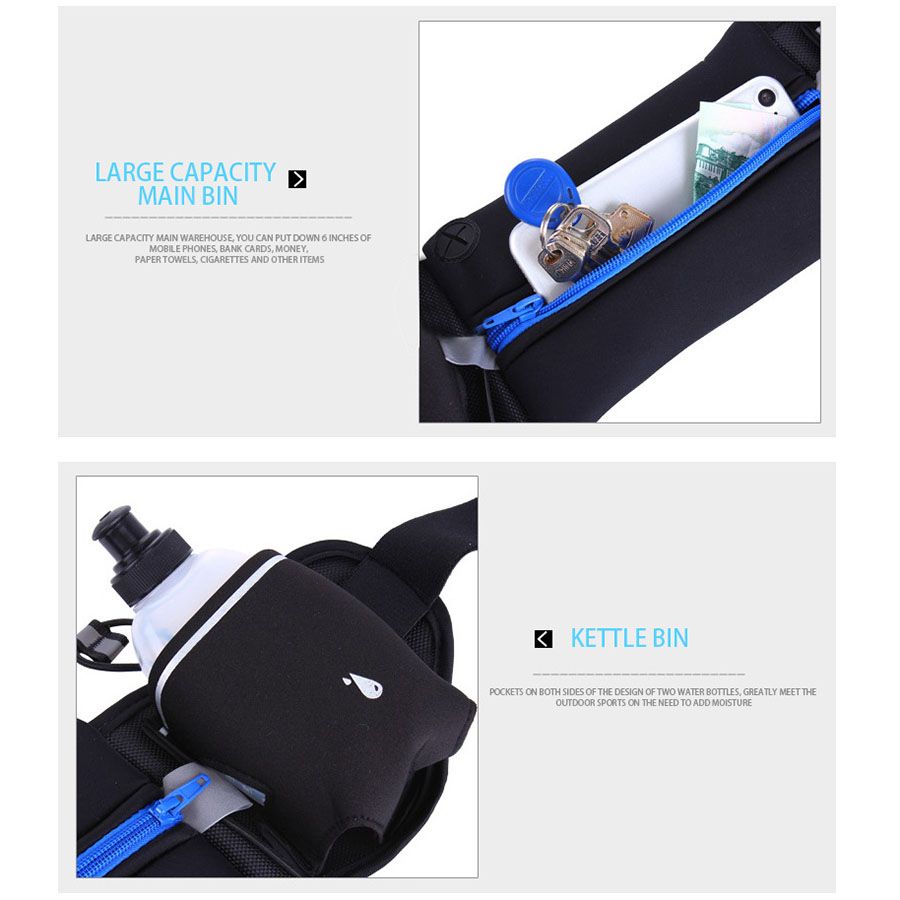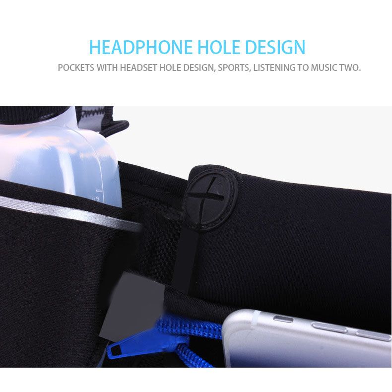 The Waist Pack is functional while lightweight. The zippered pocket allows you to take your phone as well as other items with you while doing outdoor sports.There are two extra pockets for watter bottle and a hole for your earphone cable to come out for music or taking phones.