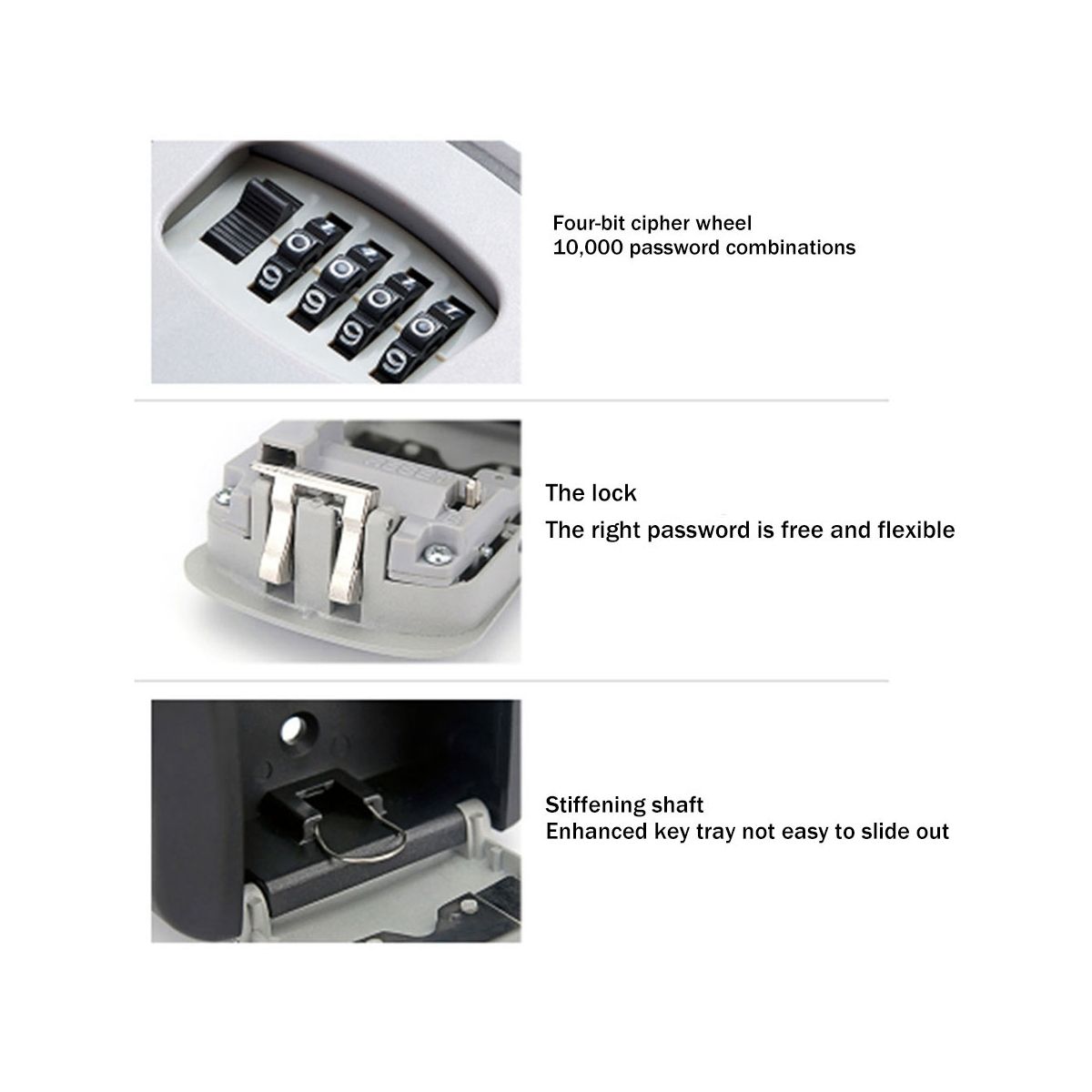Detailed Information About The Product:1. Durable material: This key lock box is made of aluminum alloy, which can protect the box from hammering, sawing or prying.