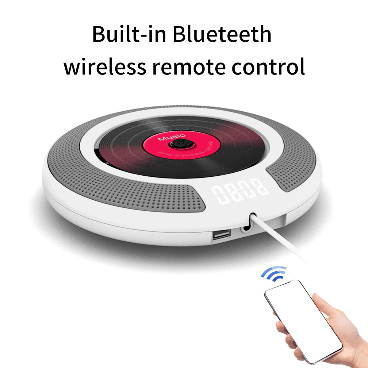 Wirele bluetooth CD player CD/MP3/WMA Support Bluetooth 5.0 Support USB FM radio function A-B repeat Support headset remote control on off timer Support headset Loop Pull switch Connect a CD music player with dual speakers to your device and play amazing music for you to enjoy. The Bluetooth CD player is widely compatible with major smartphones, tablets and computers. multiple modes The clear digital display shows playback modes including audio input mode, USB mode, Bluetooth mode, CD mode and FM radio mode. The USB disk interface supports music playback in32 format. Pull switch, easy to install Pull the switch wire to start playing, pull it again to close, simple and convenient. It has a variety of installation methods: both wall-mounted and stand-supported.