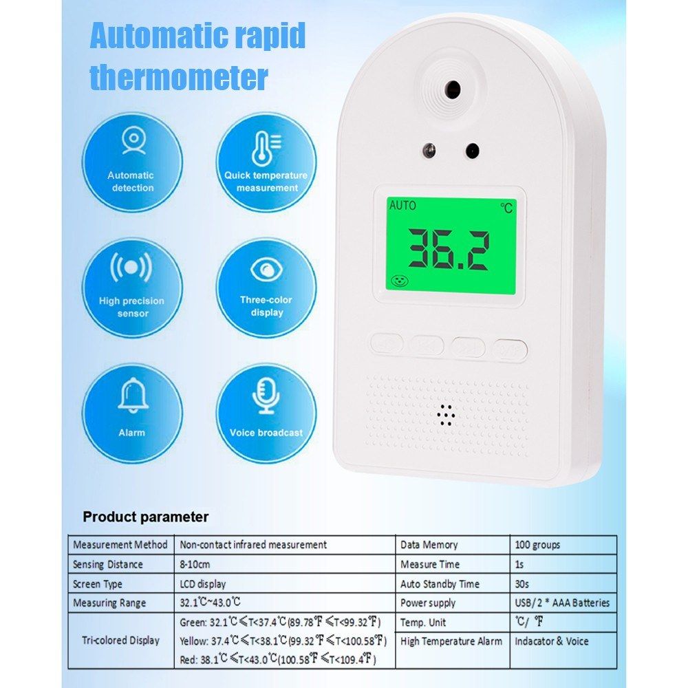 Precise infrared thermometer, 3 colors indicator with audio and visual fever warning. Quick measure in 1s, 100 groups data storage. Developed for accurate, safe and fast temperature measurements.