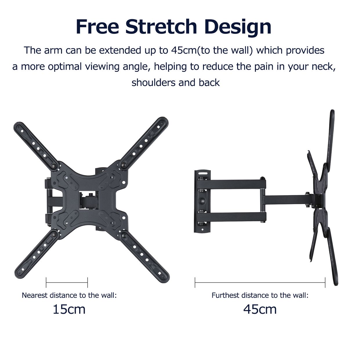 Adjustable arm offers -8 deg; to +5 deg; tilt and 360 deg; rotation. The arm can be extended up to 45cm(to the wall) which provides a more optimal viewing angle, helping to reduce the pain in your neck, shoulders and back.