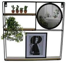 Wall Rack Metal Shelve With MirrorYOU CAN EVEN USE IT AS A PRACTICAL SHELF OR TO DISPLAY PHOTOS. Features: BROWN AND BLACK FINISH. Square wall shelf, METAL AND WOOD CONSTRUCTED SHELF. Place this beautiful wall mirror in any room with its handy shelves for displaying items. use it for showing off decorative photo frame collectibles or trophies In the bathroom, the shelves can provide extra space for holding toiletries while the mirror is easily accessible.
