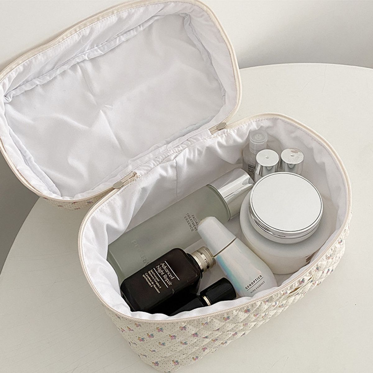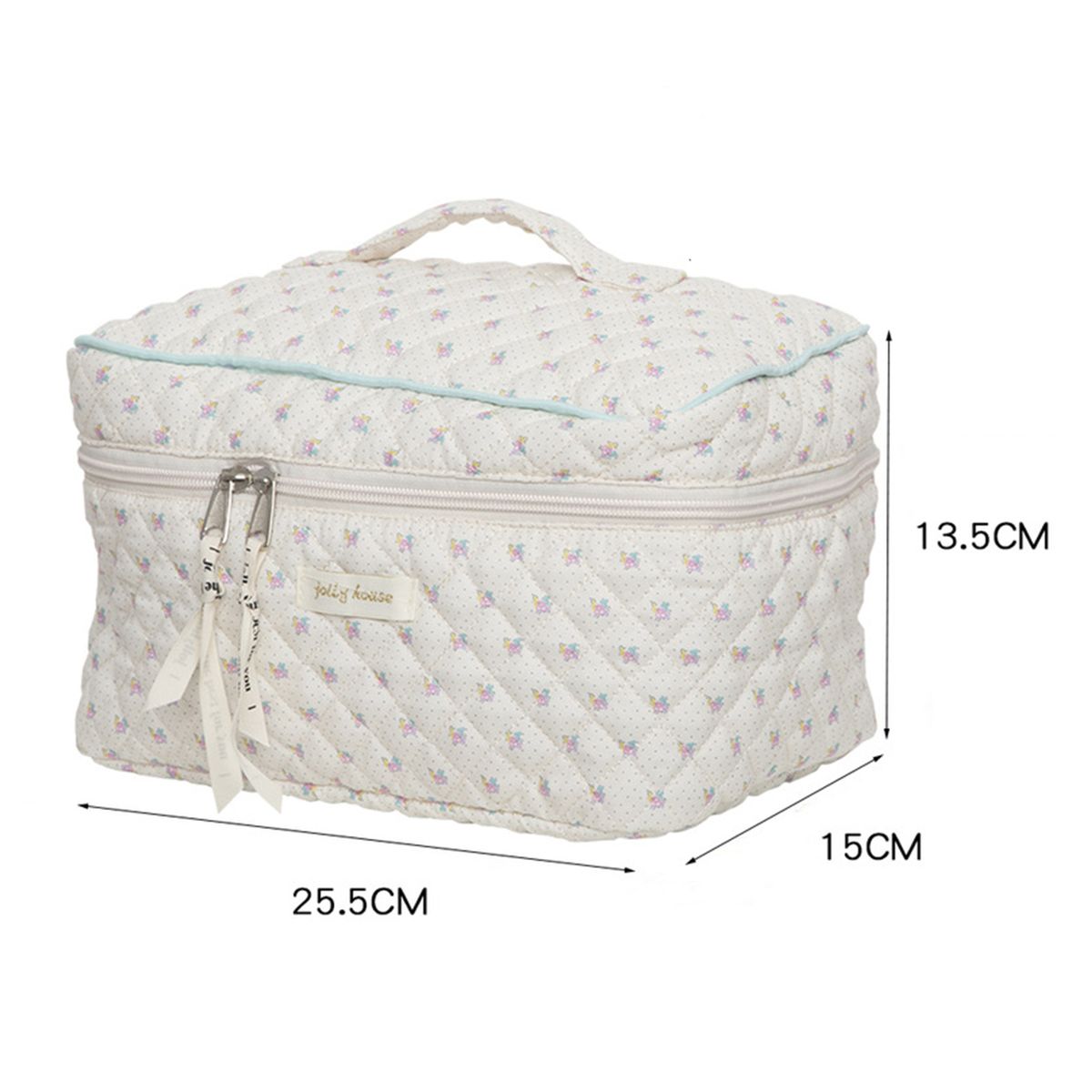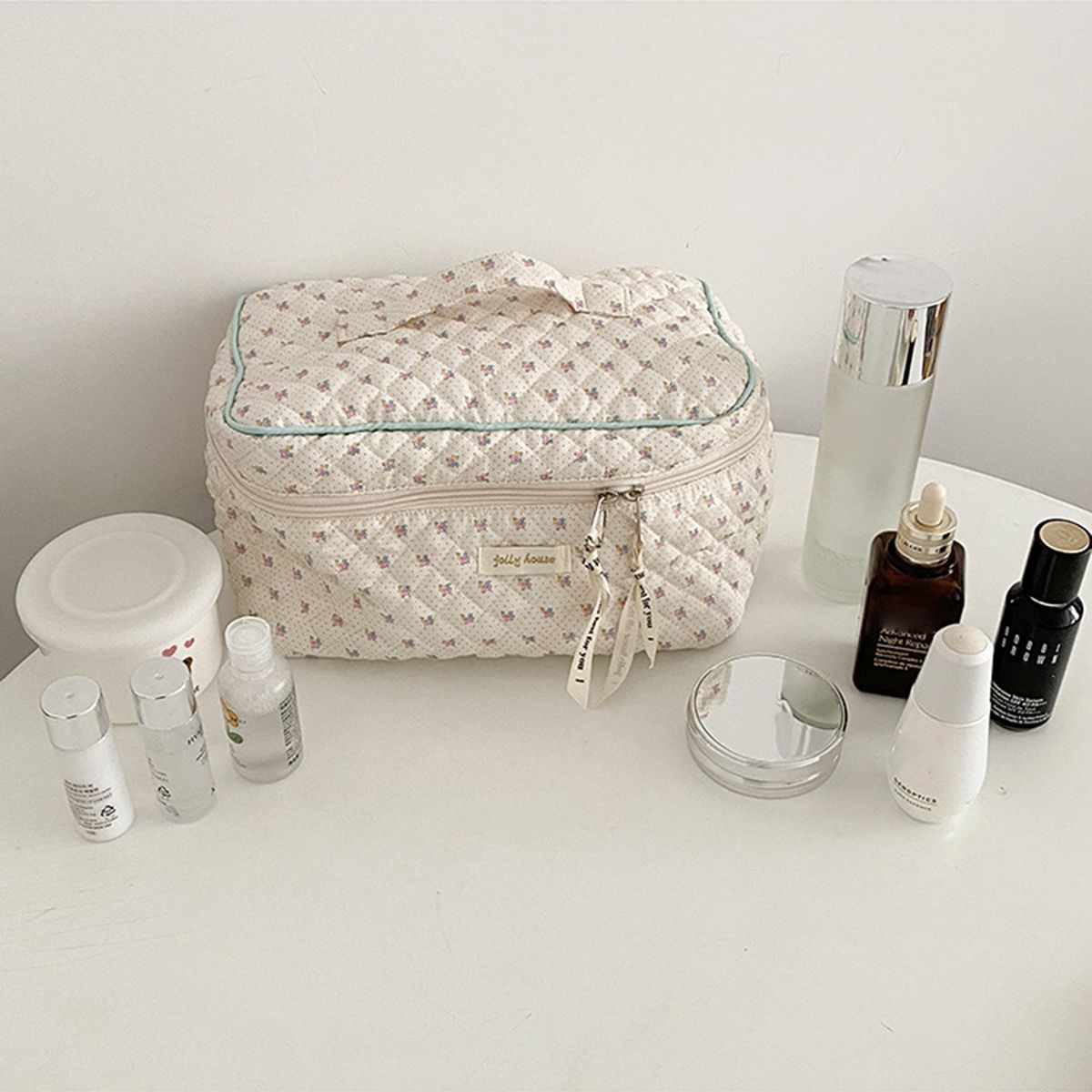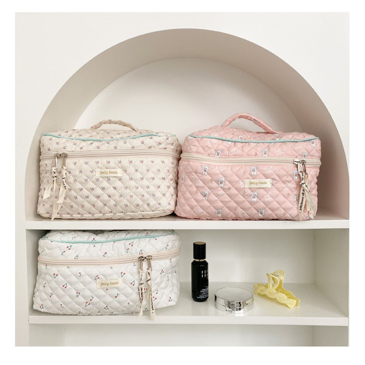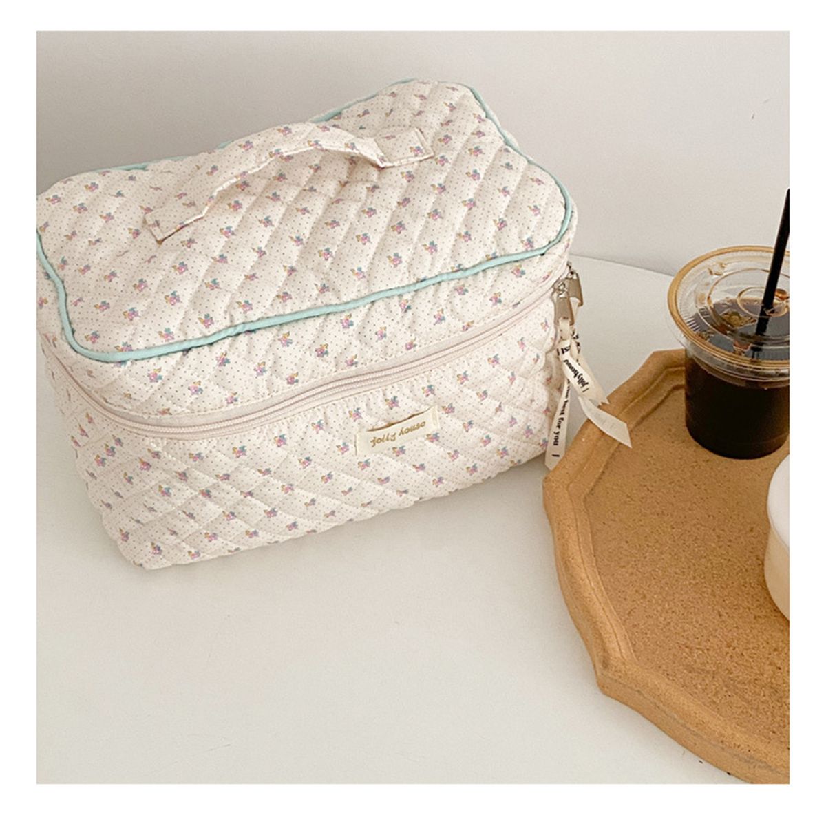 Handy handle and flat bottom keep your cosmetics safe.