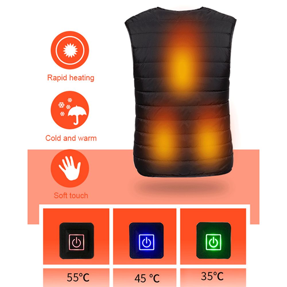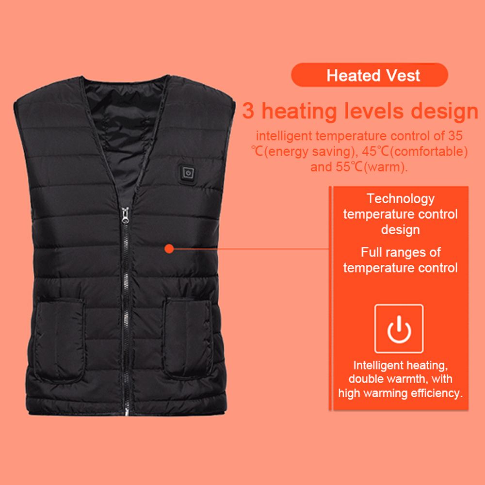 This heated vest selected quality fabric and silk-floss filling, smooth zipper, neatly cut neckline with exquisite sewing, skin-friendly, slim fit, comfortable and beautiful. 3 heating levels design, intelligent temperature control of 35℃(energy saving), 45℃(comfortable) and 55℃(warm). 5 heating zones design, humanized divisions of heating zones for the parts that easy susceptible to cold of the abdomen, waist and back to keep the body warm, help promote bloods circulation, and relieve muscular rigidity.