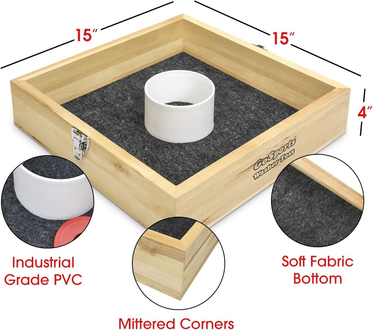 How to Play the Washer Toss GameOnce, you've finished making your Washer Toss game set, the real fun begins! If you do a little searching on the Internet, you'll find more ways to play the game than you can throw a washer at. I'll outline my house rules, but the most important thing is to have fun playing the game. So with that in mind, change the “rules” in whatever way you'd like! Here are the “rules” of the game. PlayersThe game can be played with two players, but four players in teams of two is just more fun. SetupThe boxes are placed in the yard with the cups 21 feet apart. Your teammate stands opposite you at the other box. The first player (Player A) stands next to the box and tosses their four washers (one at a time) to the opposite box followed by Player B. ScoringScoring takes place after all eight washers have been tossed. Only one team scores per round. One point is awarded for each washer inside the box, and three points for each washer inside the cup. If Player A lands two in the box (2 points) and Player B tosses one in the cup and one in the box (4 points), Player B's team scores two points (the difference between each player's total). The team that scored last tosses first in subsequent rounds. The first team to reach 21 points wins. If luck is on your side, and you manage to land a washer on top of one of the box edges, you automatically win the game!How to Play the Washer Toss GameOnce, you've finished making your Washer Toss game set, the real fun begins! If you do a little searching on the Internet, you'll find more ways to play the game than you can throw a washer at. I'll outline my house rules, but the most important thing is to have fun playing the game. So with that in mind, change the “rules” in whatever way you'd like! Here are the “rules” of the game. PlayersThe game can be played with two players, but four players in teams of two is just more fun. SetupThe boxes are placed in the yard with the cups 21 feet apart. Your teammate stands opposite you at the other box. The first player (Player A) stands next to the box and tosses their four washers (one at a time) to the opposite box followed by Player B. ScoringScoring takes place after all eight washers have been tossed. Only one team scores per round. One point is awarded for each washer inside the box, and three points for each washer inside the cup. If Player A lands two in the box (2 points) and Player B tosses one in the cup and one in the box (4 points), Player B's team scores two points (the difference between each player's total). The team that scored last tosses first in subsequent rounds. The first team to reach 21 points wins. If luck is on your side, and you manage to land a washer on top of one of the box edges, you automatically win the game!