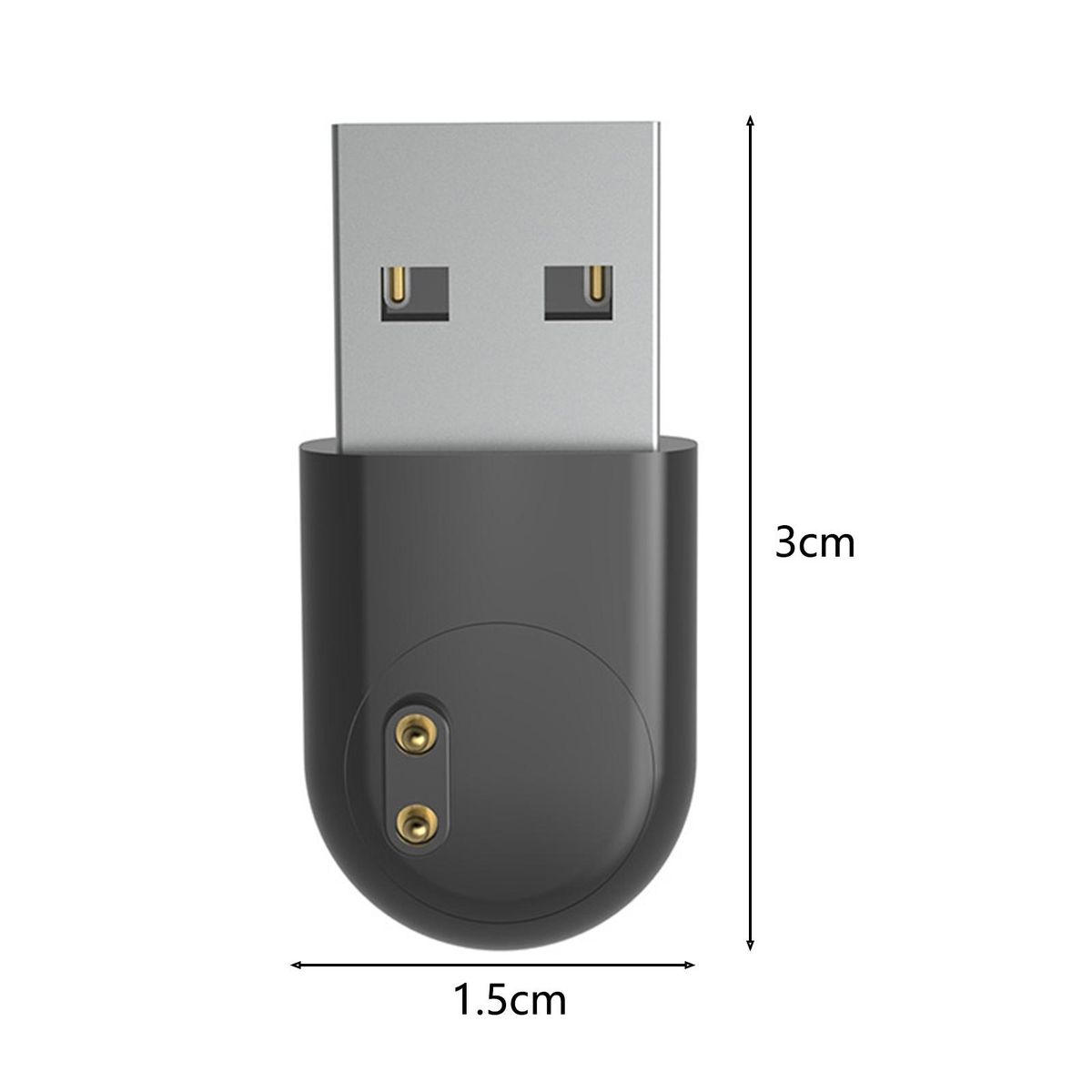 The length of this USB watch charger is 3cm, width is 1.5cm and thickness is 0.5cm.