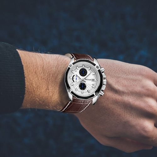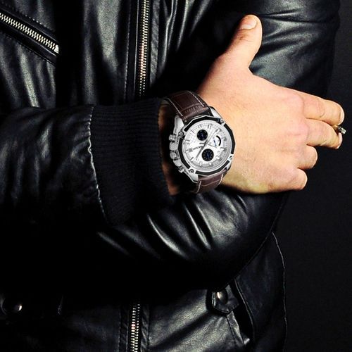 Main Feature:- Time/Calendar/Stopwatch/Luminous Function(Sub-dial Working) ; - 3ATM/30M Water Resistant(not for shower,swimming and diving);- Hardlex Dial Window;- Quality Alloy Case;- Quality Leather Watchband;