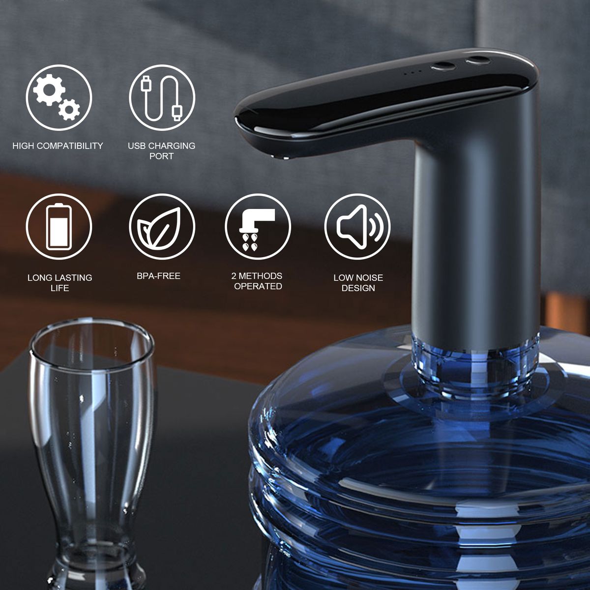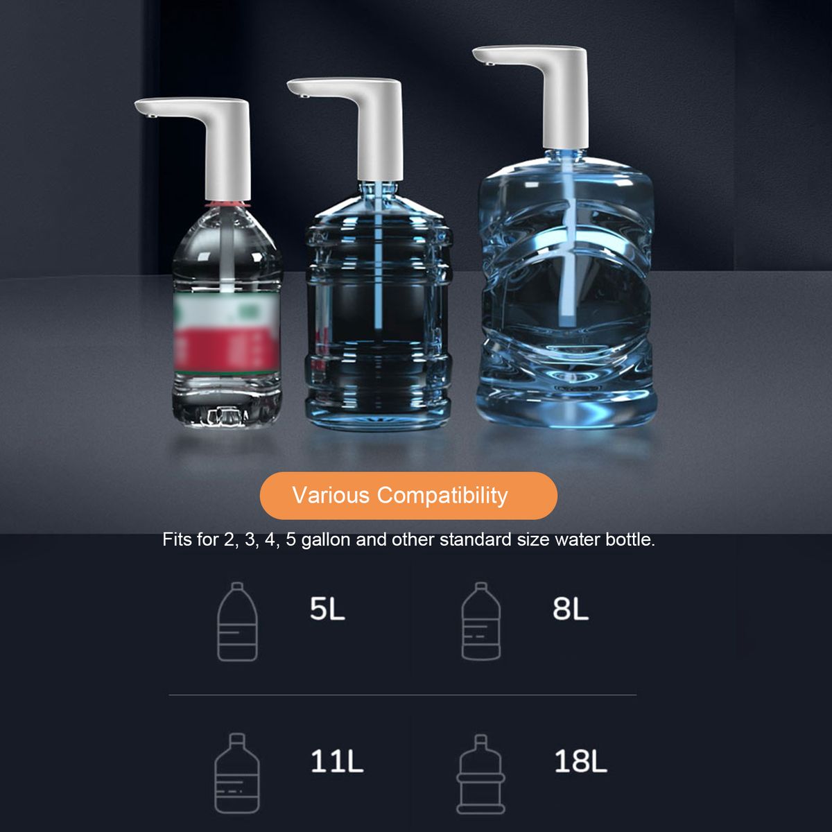 - Built-in rechargeable 1200mAh lithium battery for pumping 5-8 bottles of water after fully charged.