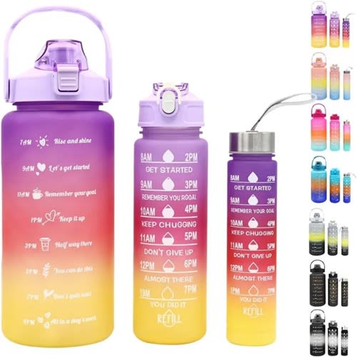 Includes: 1 x 2l bottle 1 x 900ml bottle & 1 x 350ml bottleInspirational QuotesTime MarkersFunctional DesignHigh-quality materials: PlasticBPA Free & Toxin FreeIncludes StrawColours sent at random*Design may differ but functionality will remain the same