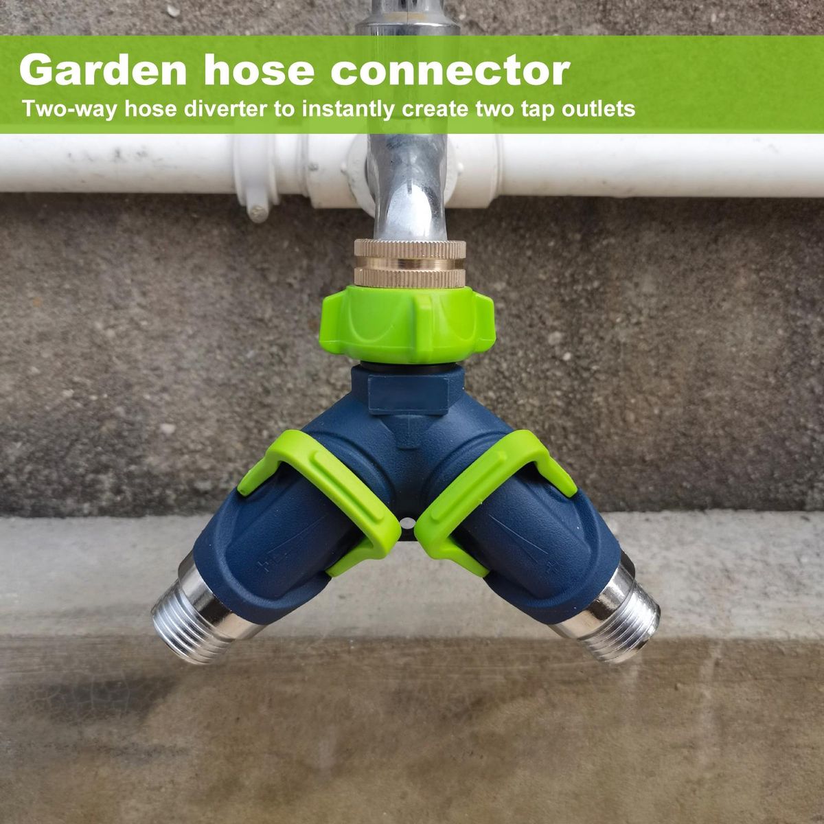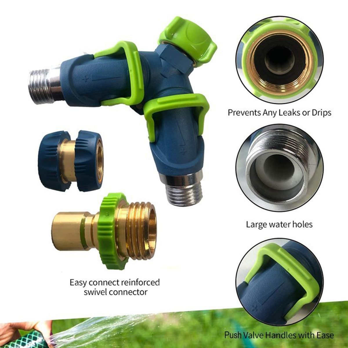 This hose splitter has 2 way heavy duty design to convert one faucet into two independently water outlets, providing much more convenience in garden watering, washing car, cleaning house, showering pets and so on.