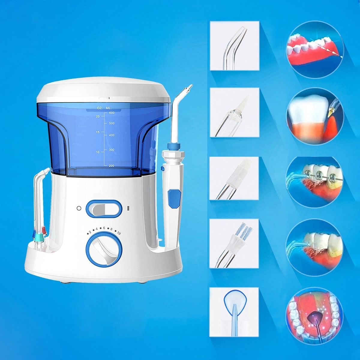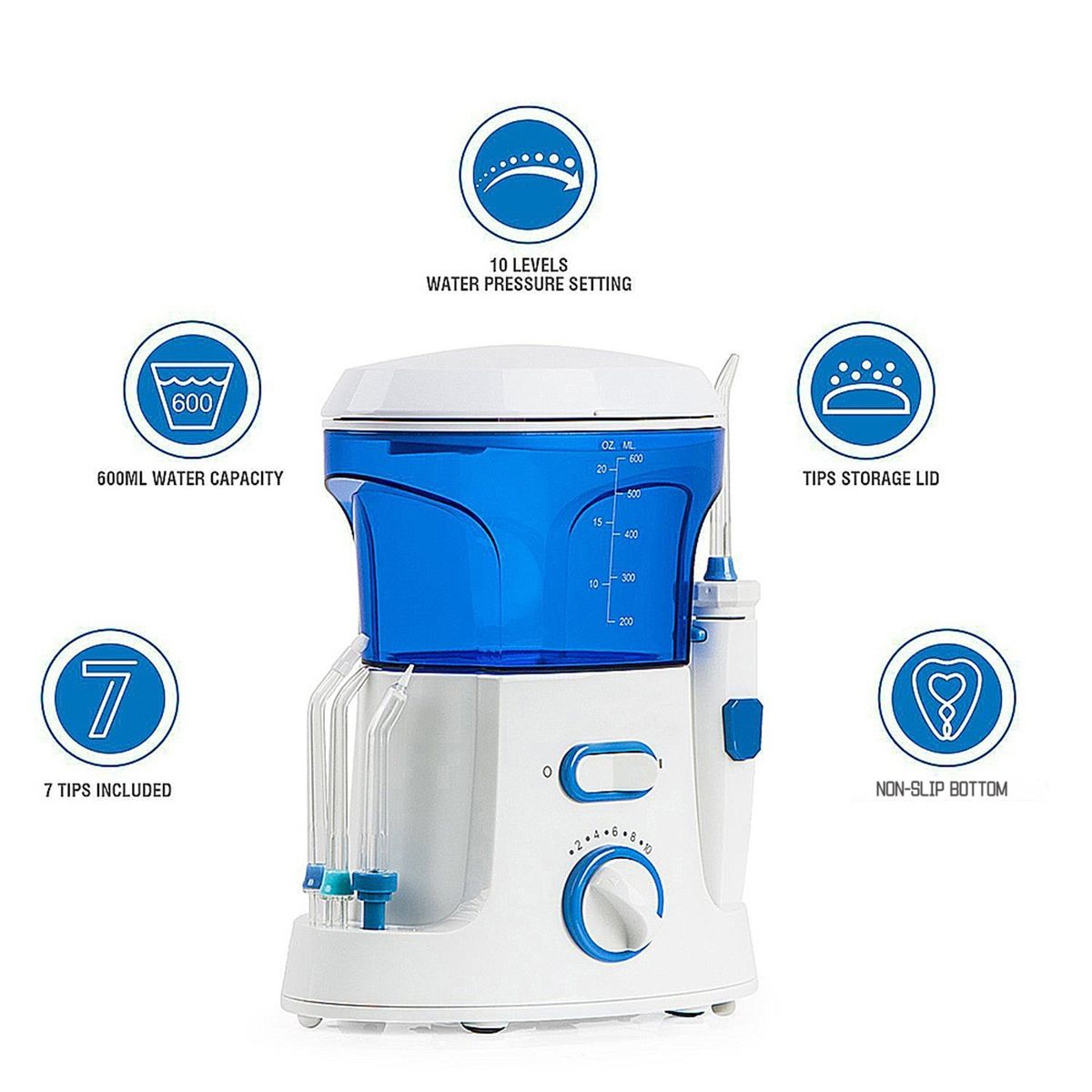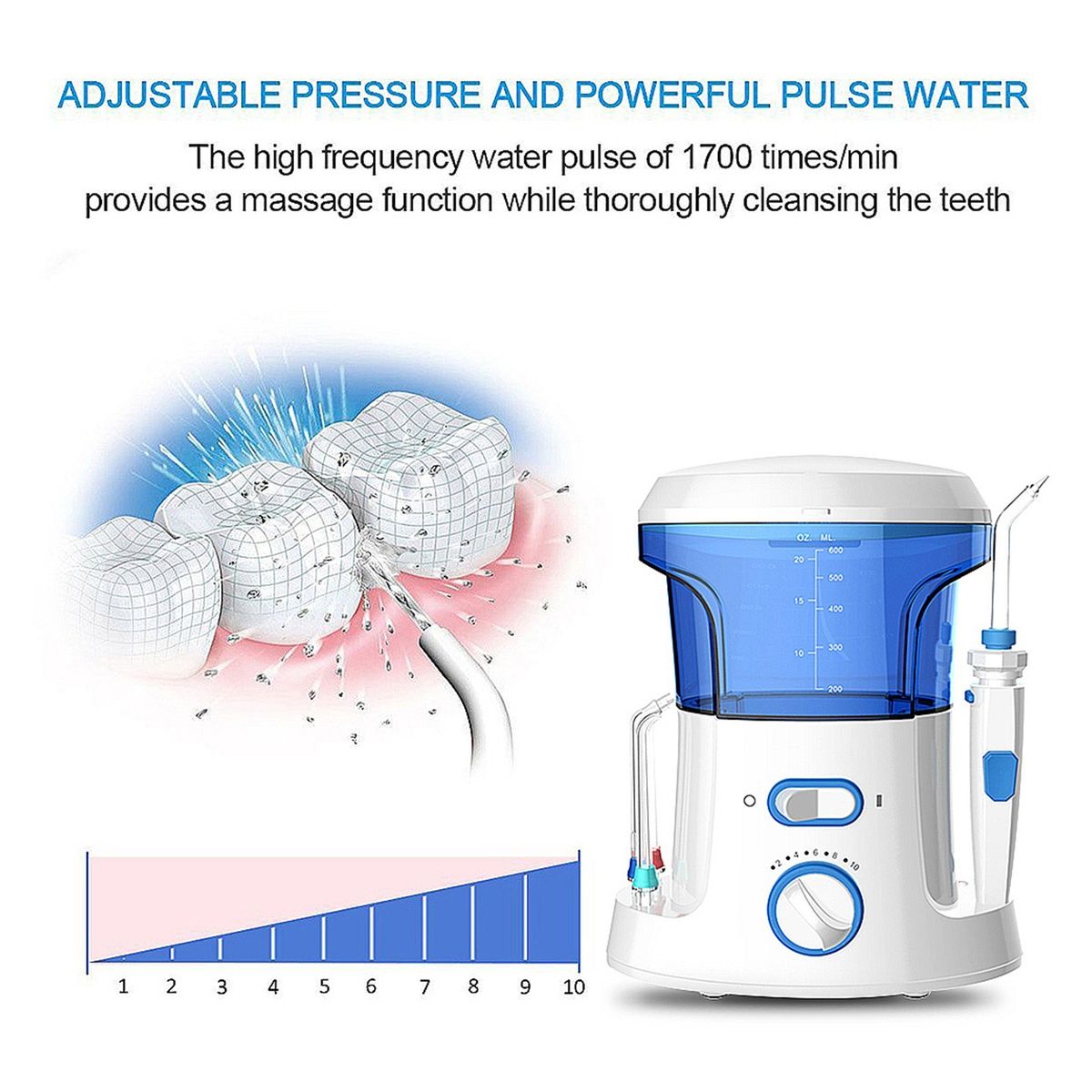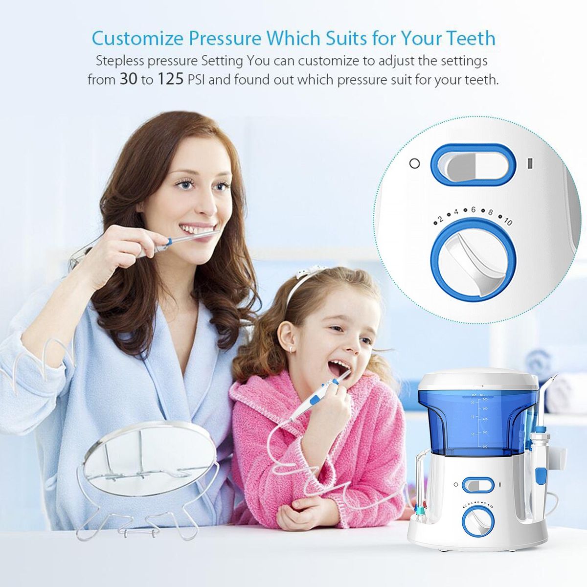 The oral irrigator comes with 7 tips for family use. You can easy to control water flow with an on/off switch on the handle. It use 1250-1700 times/minute high-pressure water to wash away food residues in the mouth, eliminate bad mouth odors, and bring a different freshness.