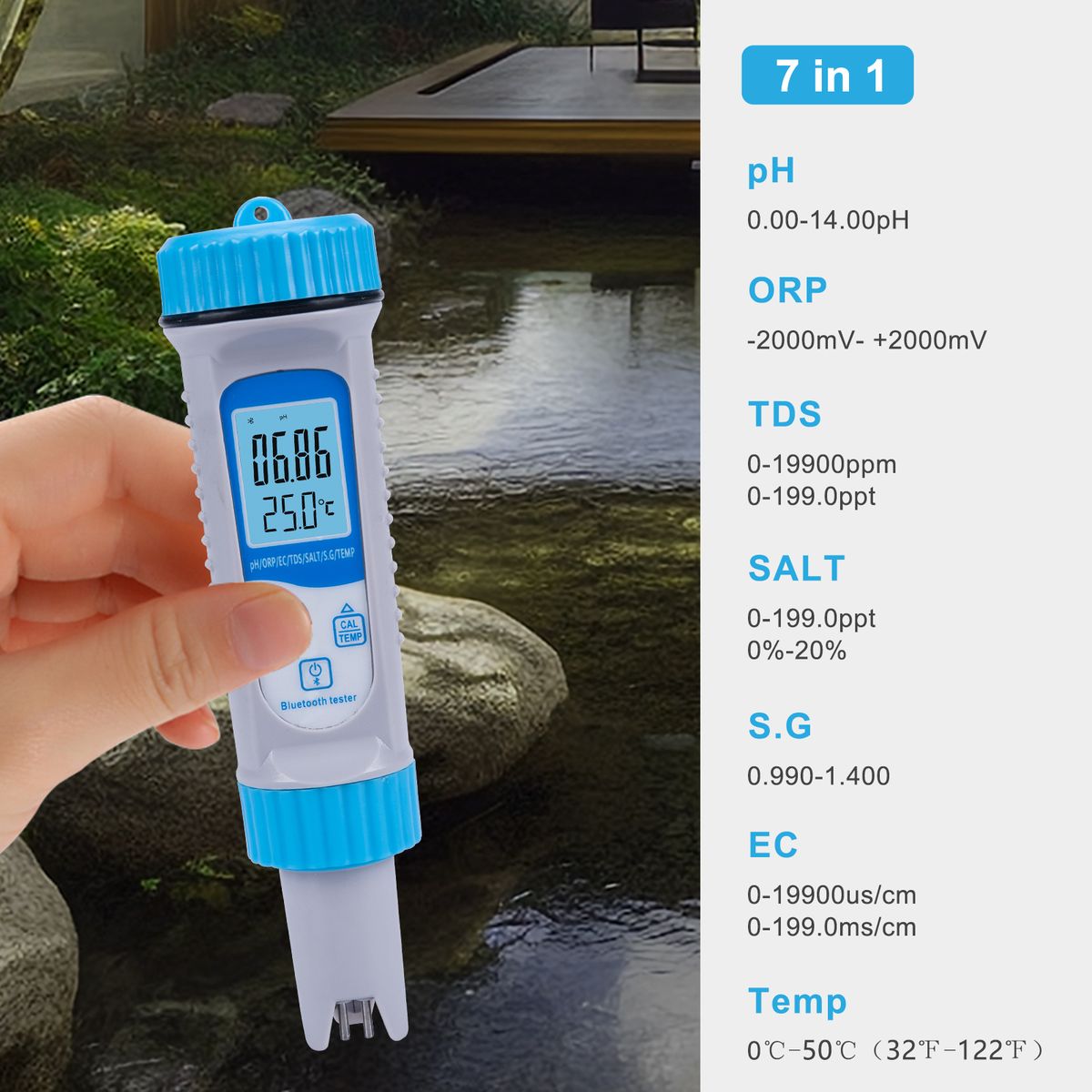 Features:【7 In 1 Function】Water quality tester with full function, can measure PH, ORP, EC, TDS, SALT, S.G, TEMP, switch at will, simple and portable.