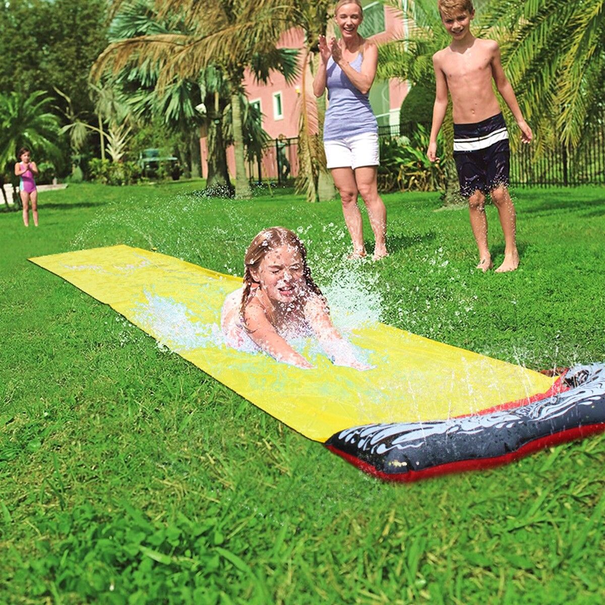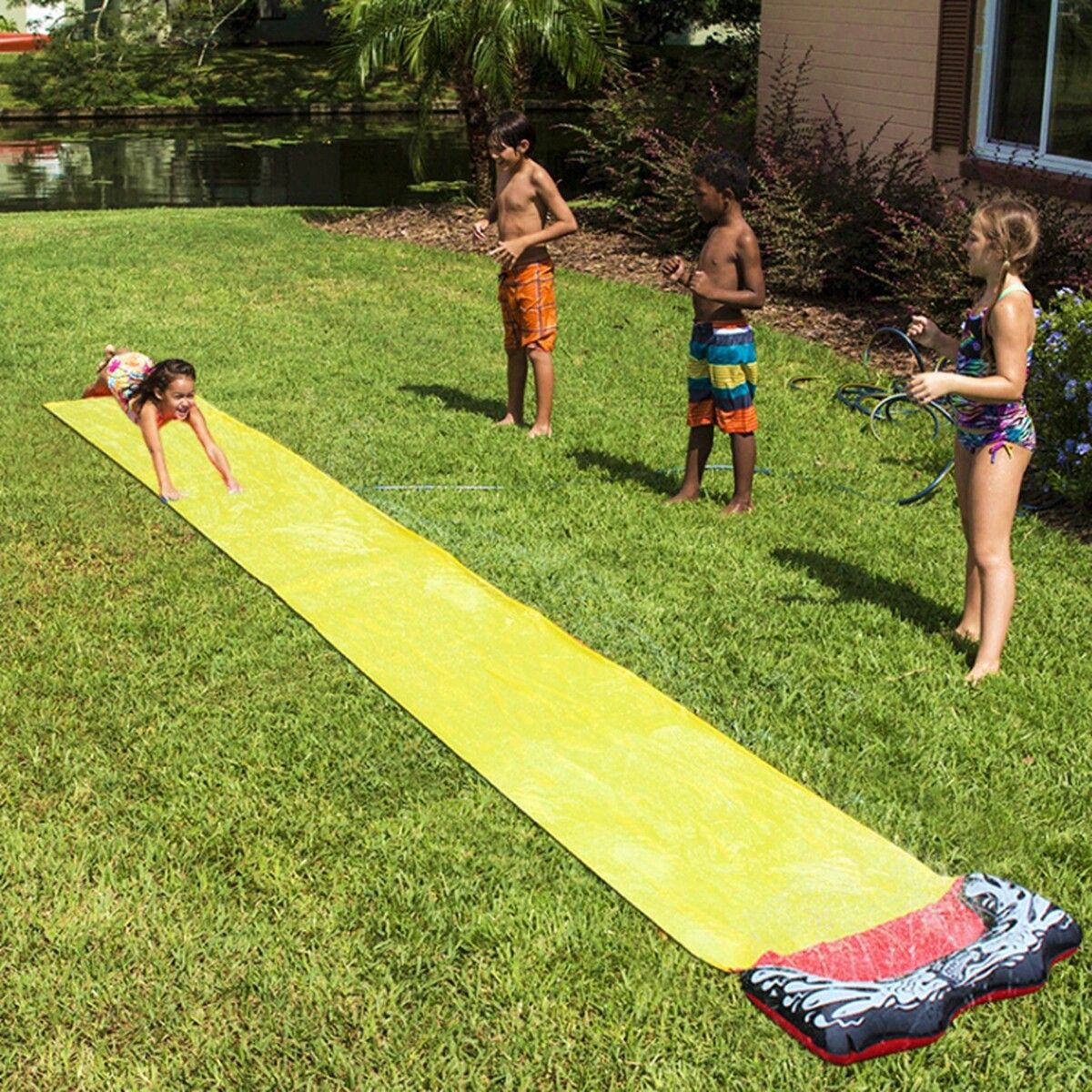 The new children's waterslide, grass sprinkler pad