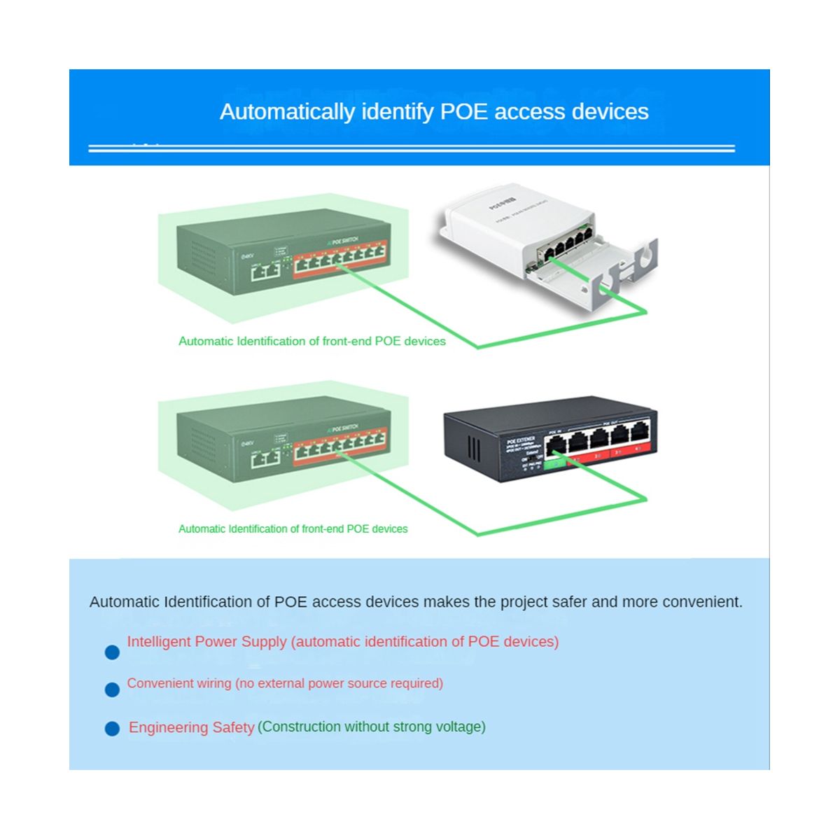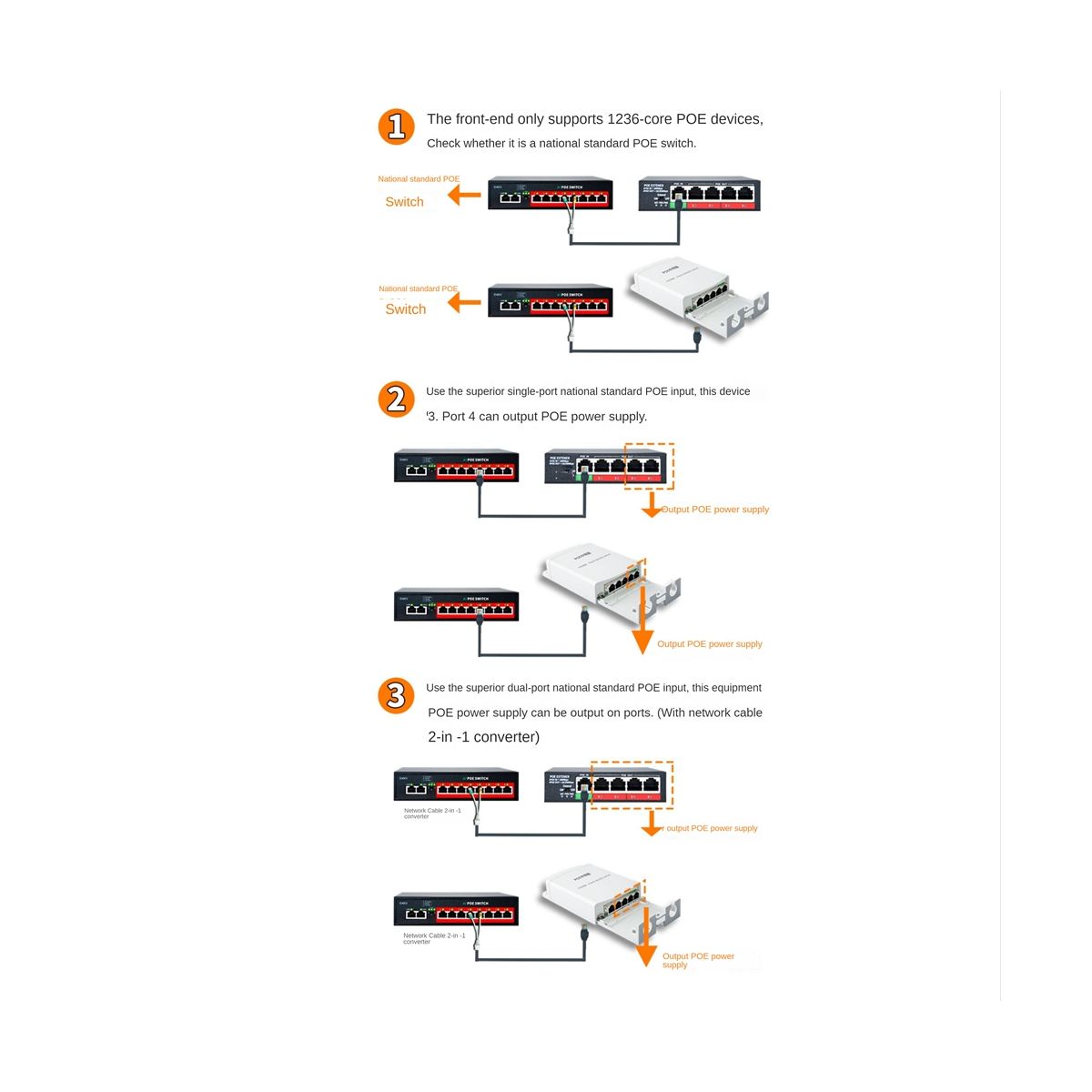 [Warm tips]This product can`t be used in pairs, each port can only use one POE extender, if used more than one, will lead to short circuits, overload and other Rick damage to the device.Only support for national standard POE device, confirm that is a national standard POE device.