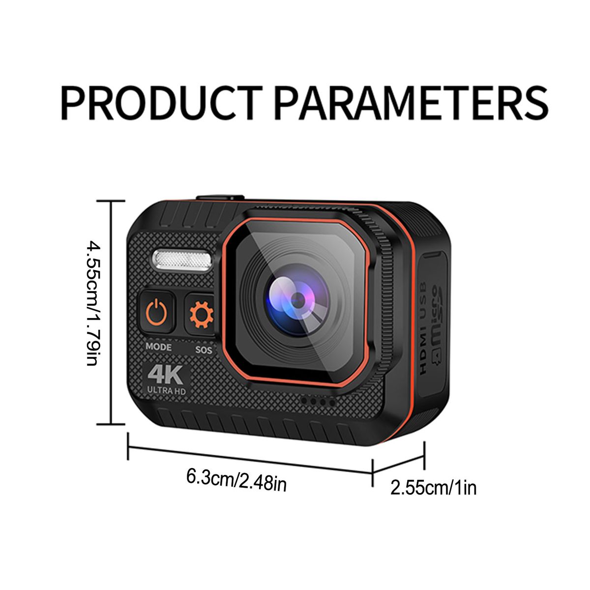 Description: Action Camera provides profeional 4K/30fps, 2.7K/30FPS, 1080P/60FPS, 1080P/30FPS, 720P/120FPS video resolution and 20MP images. This underwater camera adopts a sturdy IP68 waterproof camera, which provides better water , and the sports camera can be directly underwater to 5 meters. You can explore more features with this action camera, such as loop recording, time-lapse, slow motion, selfie, burst, driving mode and more, allowing you to capture all the details of your adventure. Specification: Name Action Camera DDR: 2Gbit r: OV8838 Photo Format: JPEG Video Format : mp4 Body Size: 63.0*45.5*25.5mm Net Weight: 76g Body Memory: no memory in the body, need to insert T card LCD Size: 2.0-inch IPS high-definition screen Battery Capacity: 1000mAH Standby: When the camera is not working, you can set the screen off for 1 minute, 3 minutes, 5 minutes Working Time: about 95 minutes Charging Time: about 1.5 hours Charging Adapter: USB cable Data Link : USB interface 2.0/wifi Voice Selection: English, French, Spanish, Portuguese, German, Italian, Ruian, Simplified Chinese, Traditional Chinese, Japanese WiFi Function: Support Application Features: Support (RORO cam v3.9.5) Micro Recording: Support Slow Motion Video: Support Loop Recording: Support Vehicle Mode: Support Zoom Function: Support Time Setting: Support Photography Resolution: 16M(4640x3480)/12M(3648x2736)/8M(3264x2448)/5M(2592x1944)/2M(1600x1200)" Video resolution: 4K(3840×2160)30fps/2.7K(2704×1520)30fps/1080P(1920×1080)60/30fps/720P(1280×720)120/60/30fps" Storage Mode: card (maximum 128GB) Special Features: IP68 bare metal waterproof, SOS emergency signal light, outdoor flashlight lighting, continuous shooting, video recording, automatic shooting, WiFi link, wirele remote control Packing List: 1*Camera 1*Bike Mount 1*s Mount 3*Adapter Brackets 1*Mount 1*Adapter 1*Remote Control 1*Charging Cable 1*Bandage 1*Wipe 1*Manual 1*Hand S 1*J-holder