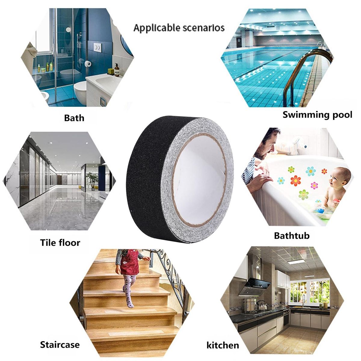 Our non-slip tape, the perfect solution to ensure safety and prevent accidents on slippery surfaces. our tape is designed with a highly durable waterproof strong adhesive layer, guaranteeing that it won't peel off even after prolonged use. with its easy application, simply cut the anti-slip tape to your desired size, peel off the protective film, and stick it onto a clean surface. for optimal results, press the tape firmly to ensure adequate contact with the surface.