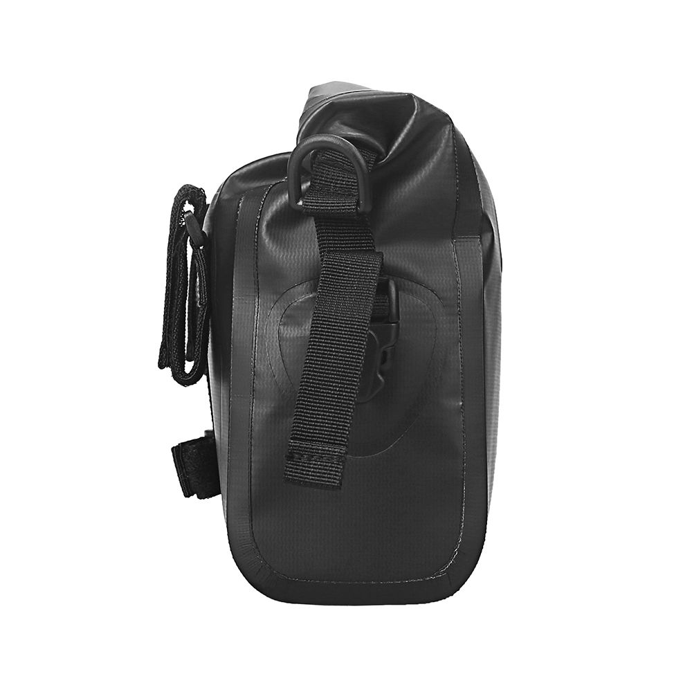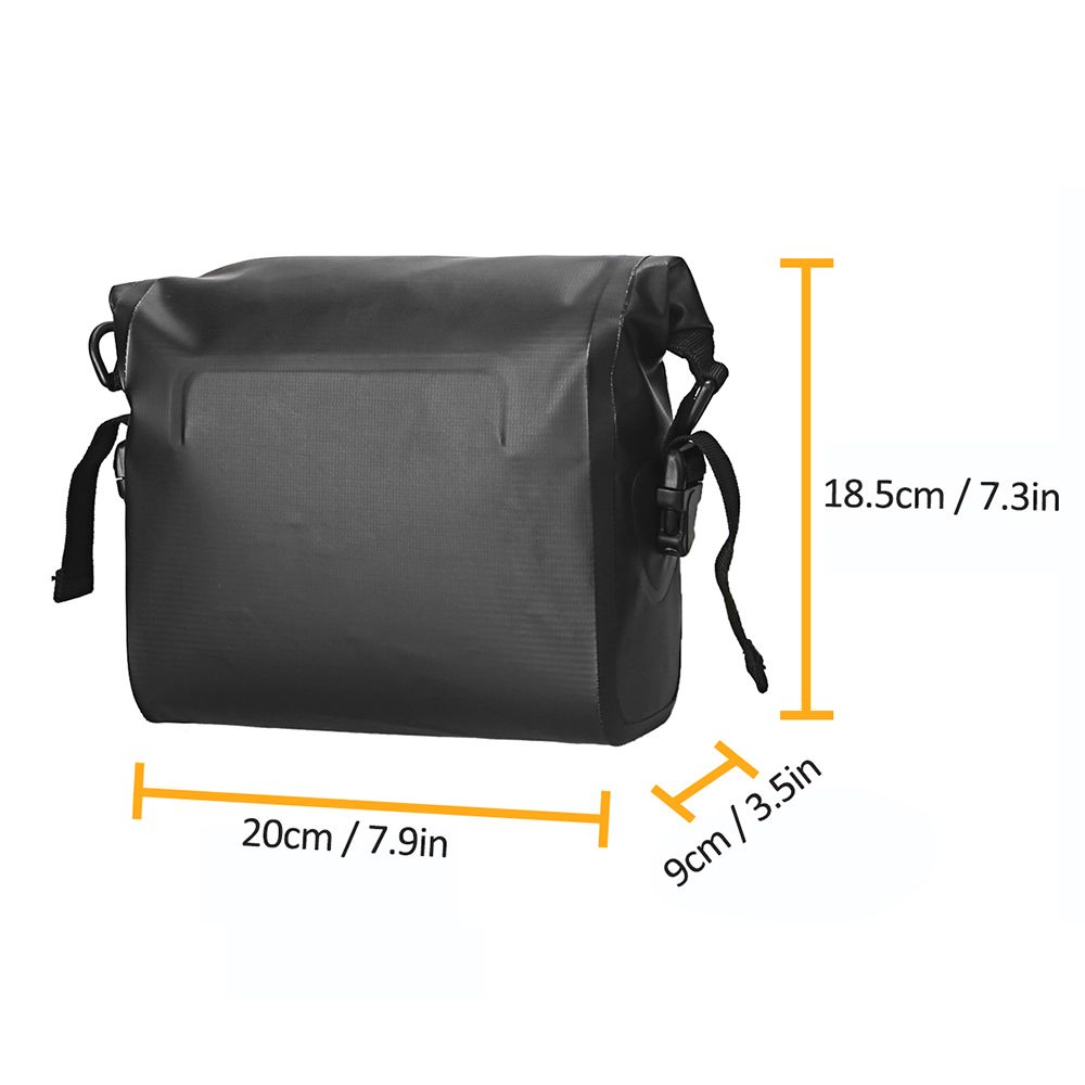 The handlebar bag is made of PVC material, waterproof and durable. It features a roll-top design and quick-release buckles to keep your s dry. With adjustable mounting straps, the bag can be installed on the handlebar of mountain bikes, road bikes, electric bikes, and scooters. You can also carry it across the shoulder with the adjustable shoulder strap.