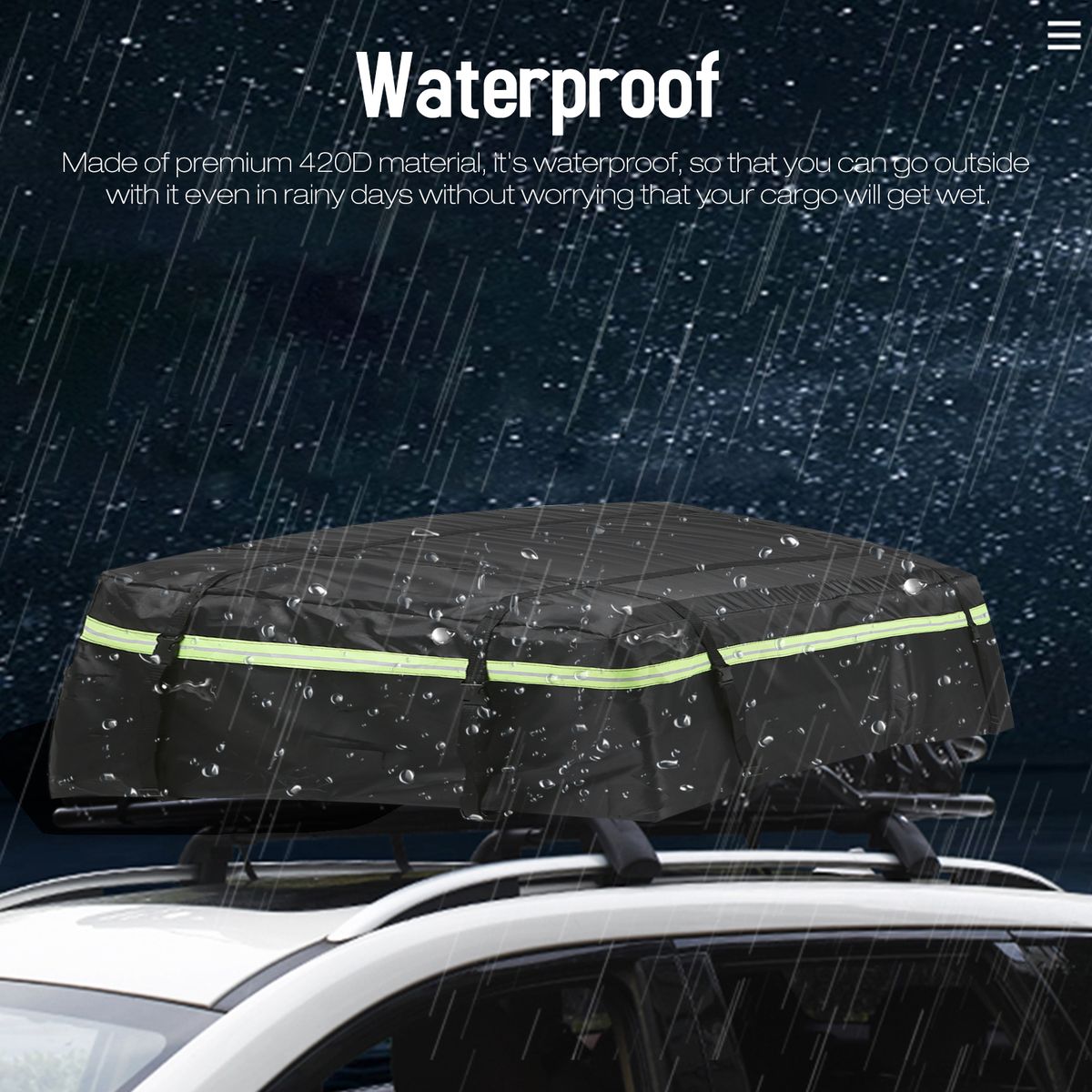 Waterproof: Made of premium 420D material, it\'s waterproof, so that you can go outside with it even in rainy days without worrying that your cargo will get wet.