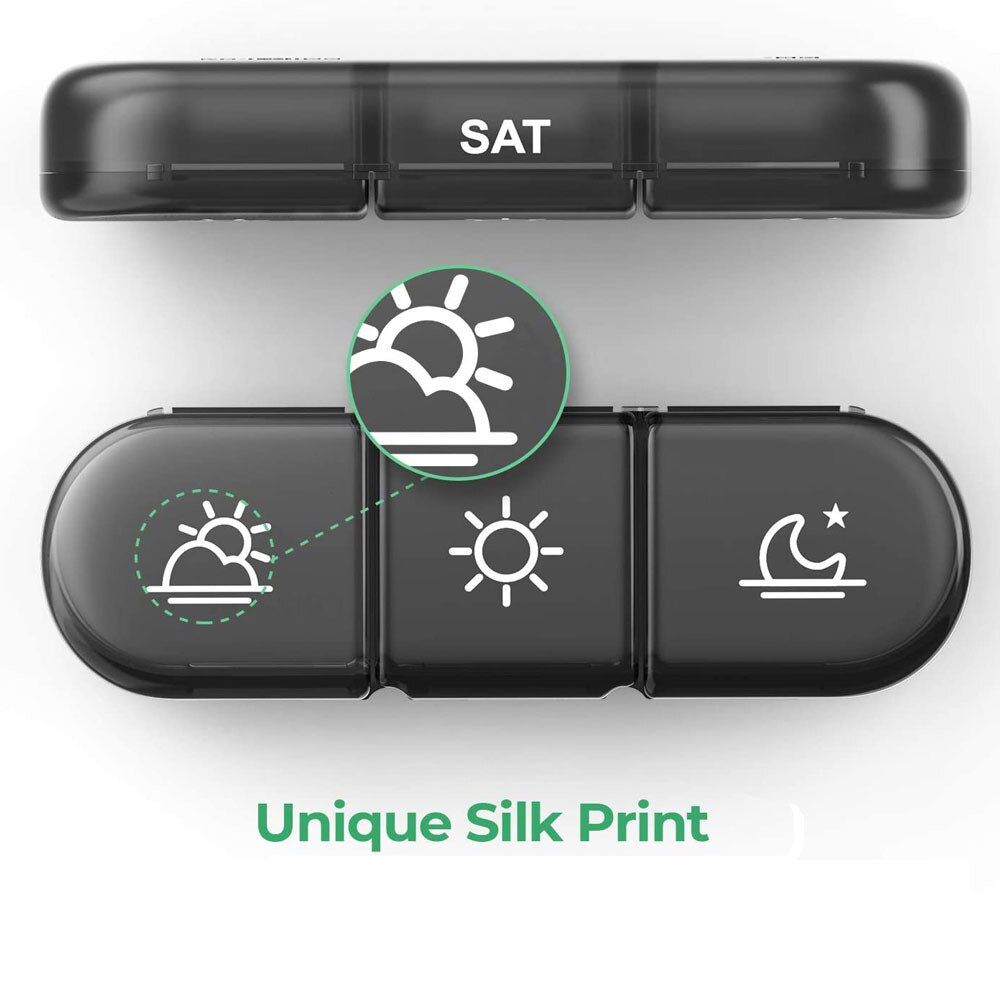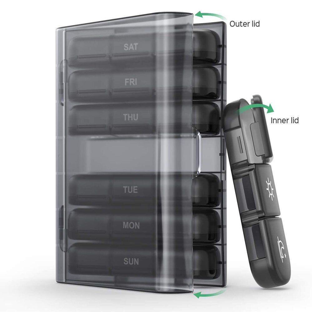 Item: box 7 days Organizer 21 grids 3 Times One Day Portable Travel with Large Compartments for Vitamins Fish Oils Package included: 1 x Organizer Case ------------- Description: 1. Large Capacity: The daily box organizer has a large space, allowing you to fill and sort weekly s in advance, and you can easily track and maintain the medication plan through it. ------------- 2. Durable and BPA-free Box: This premium containers is equipped with high-quality solid-state ABS external holders and high-quality food-grade PP daily box organizer. Made of BPA-free food-grade materials, it is environmentally friendly and practical to ensure your s are safe to eat. ------------- 3. Say No to Dumpage: Each 7 day organizer has 3 separate cases, and the smooth surface won't have residues, thus your s won't mixed with the previous residues, and also it is easy to clean. The double protection design makes the lids of the box 3 times a day always stay closed, never pops up. ------------- 4. Permanent Date Reminder: After using it for a period of time, don't worry about the letters on the lid fading, our upgraded printing of medication organizer can be used up to 9,000 times. ------------- 5. Track Your Medication: container (morning, noon and night) sort your s 3 times a day; larger black shell can accommodate 7 independent box organizer to plan the s for a week. Separate holder, this dispenser has 7 movable vitamin organizers, which can be taken out separately every day for your on the go use.