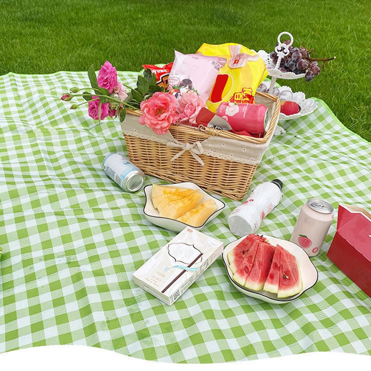Our picnic blanket, the perfect companion for all your outdoor adventures! this classic plaid patterned blanket adds a vibrant touch to any picnic setting, making it a must-have for your next outing. its portable handle and foldable design make it incredibly easy to carry and store, ensuring that picnics are a breeze.
