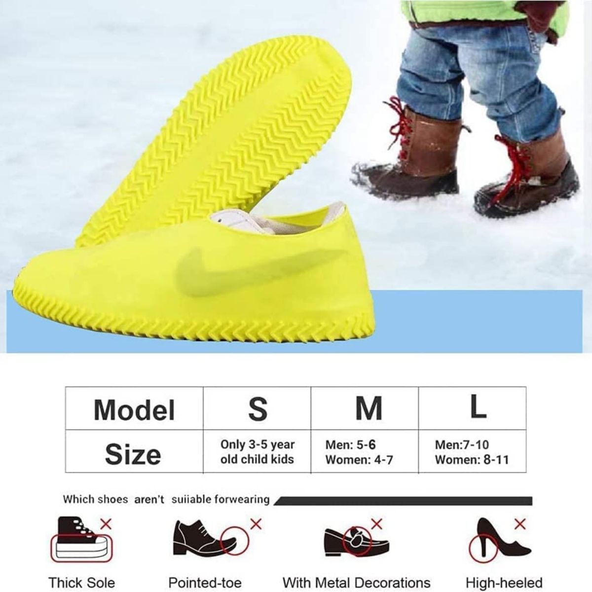 Main applicable place: Wet floors, puddles, etc. to isolate shoes or feet from liquid contaminants such as water, mud, oil, etc.