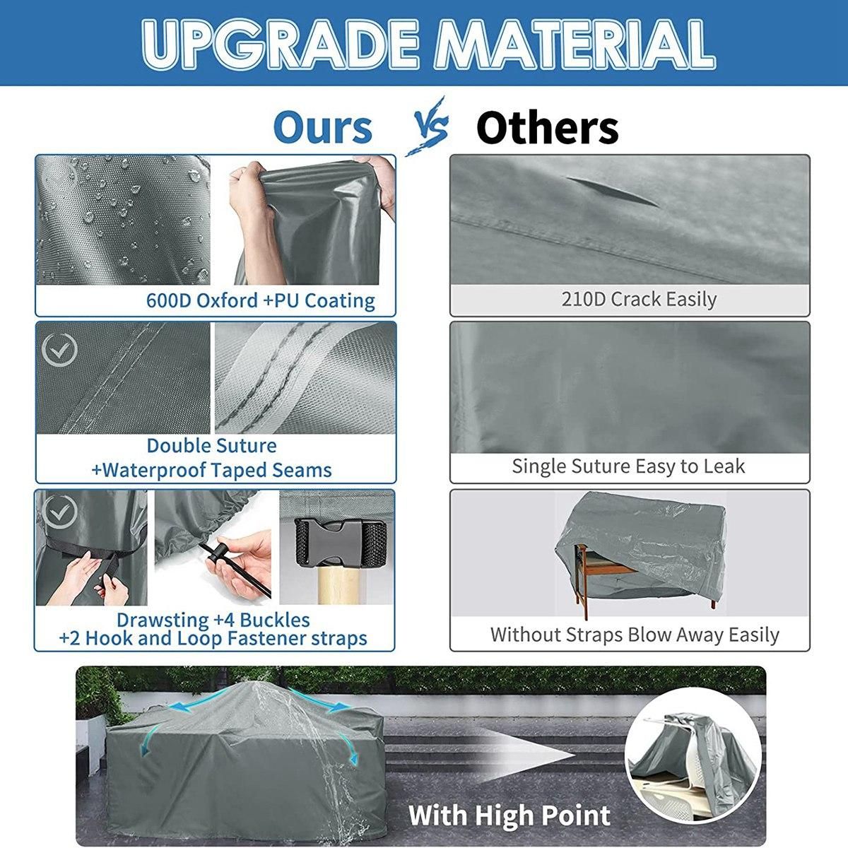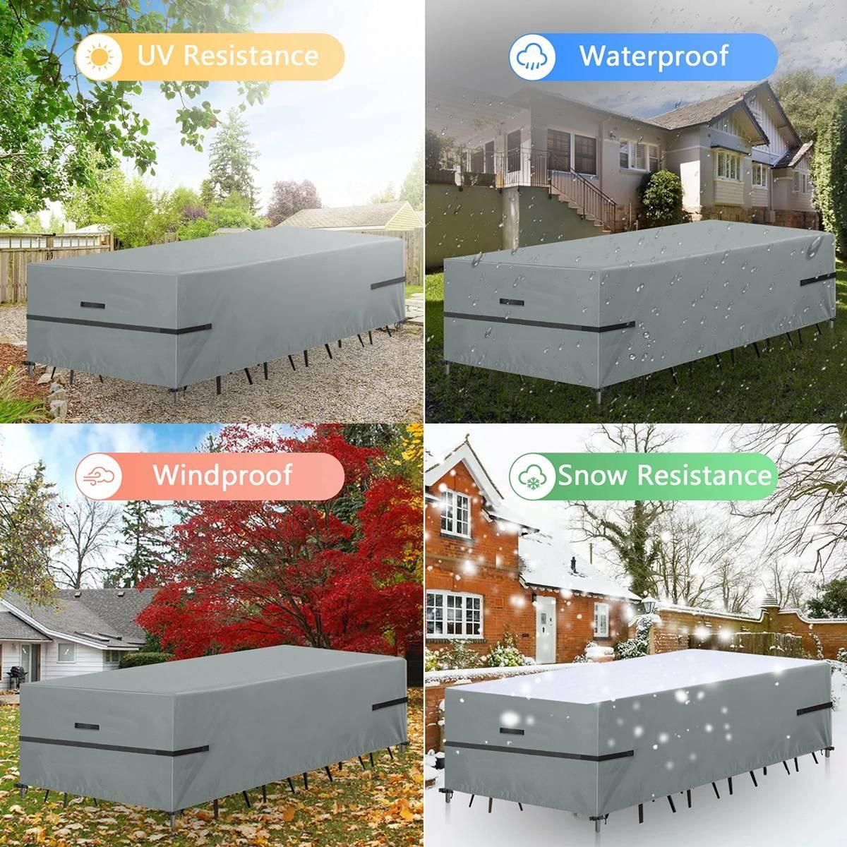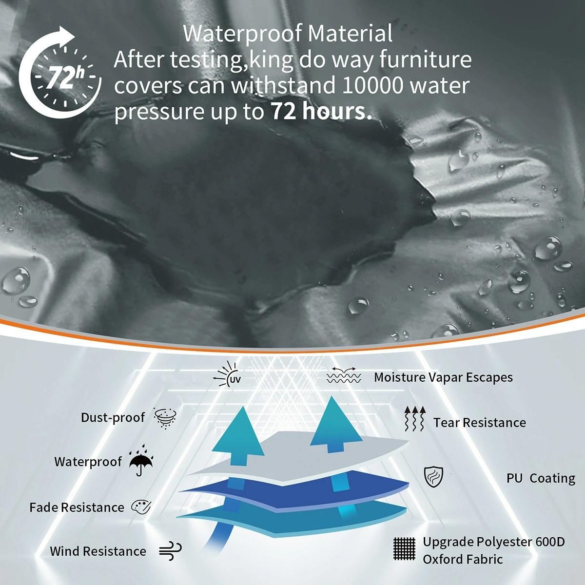 Features:[IMPROVED MATERIAL WATERPROOF VERSION]: Developed a high-quality garden furniture cover with tight stitching material and PU coating. After repeated testing by the factory, the garden furniture cover can withstand 8000mm water pressure for up to 72 hours without leakage. This hydrophobic material and double bound edges provide full protection.