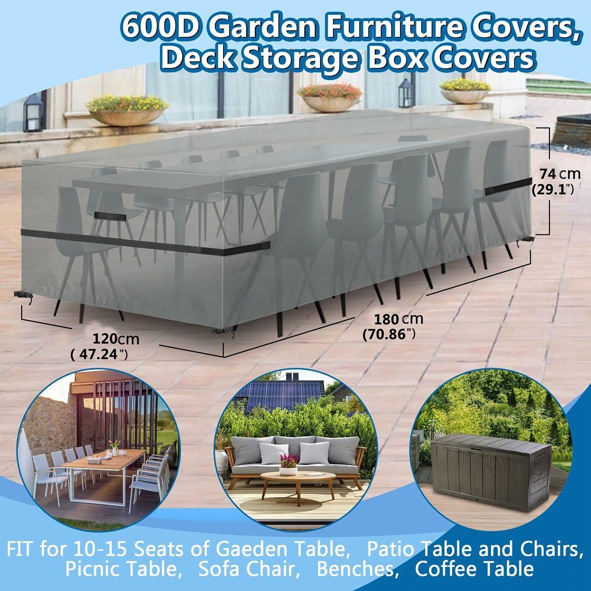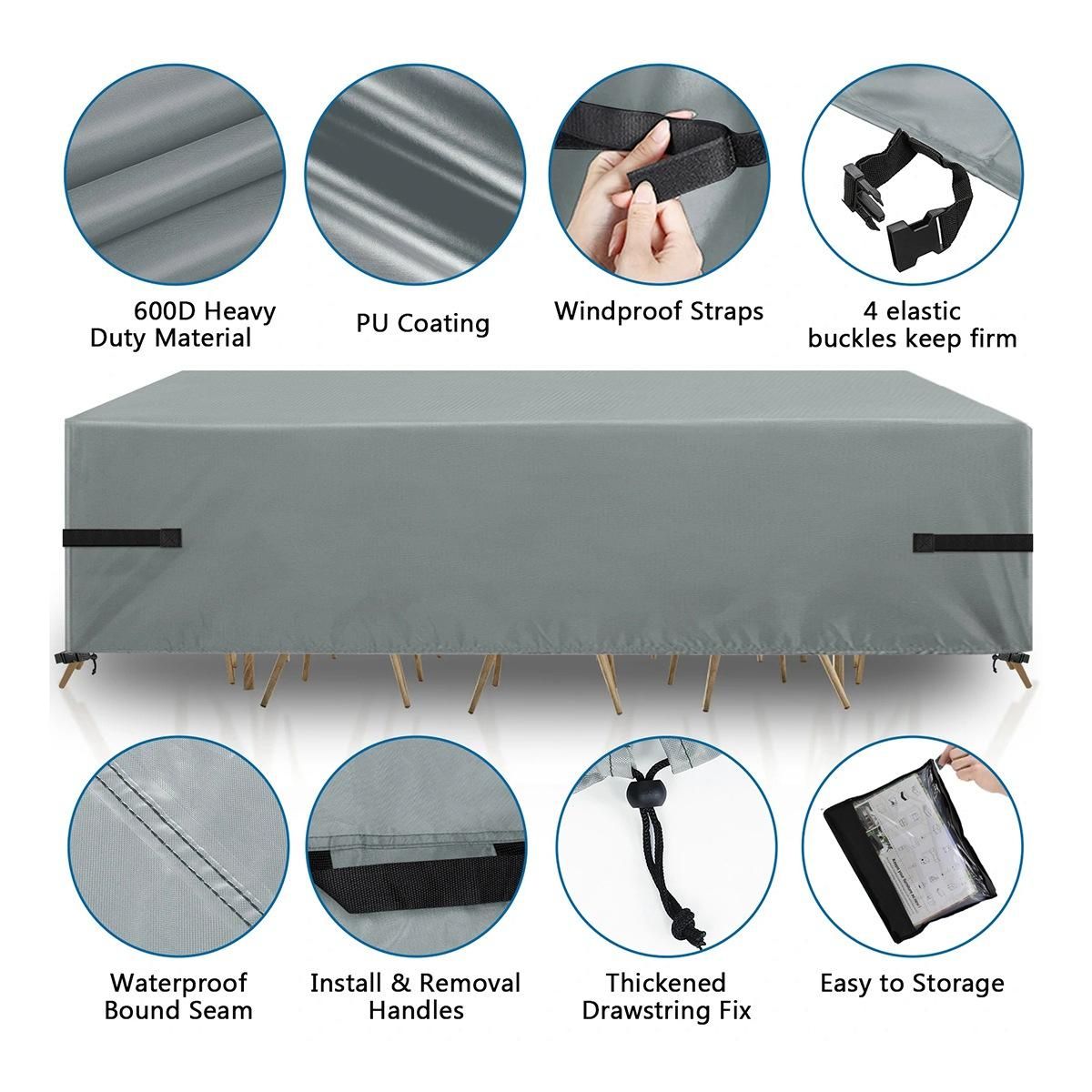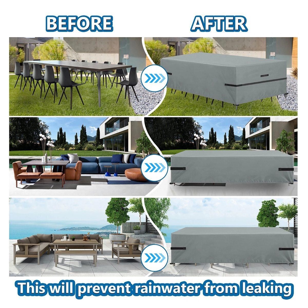 Features:[IMPROVED MATERIAL WATERPROOF VERSION]: Developed a high-quality garden furniture cover with tight stitching material and PU coating. After repeated testing by the factory, the garden furniture cover can withstand 8000mm water pressure for up to 72 hours without leakage. This hydrophobic material and double bound edges provide full protection.