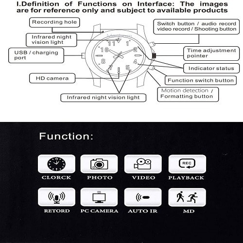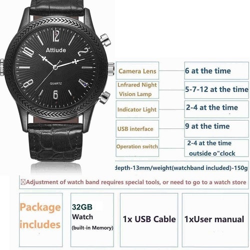 Hidden Camera - This hidden camera looks just like a men's watch, so no one will notice it. Besides, no indicator light is on when working. With built- in hidden camera lens, you can use it to record. Quality enough for you to see what was happening.