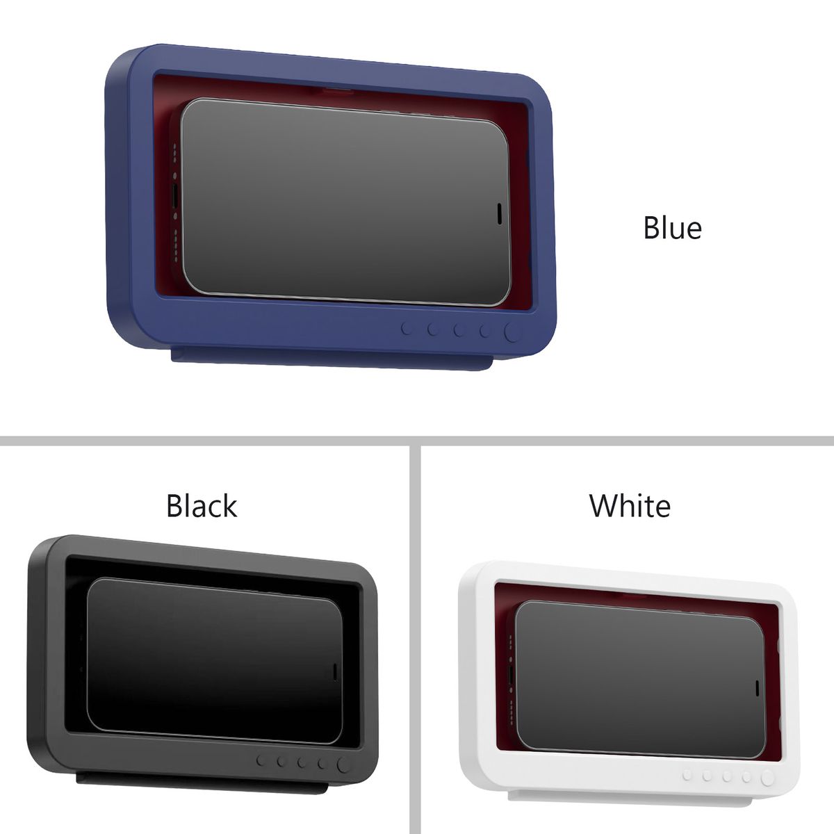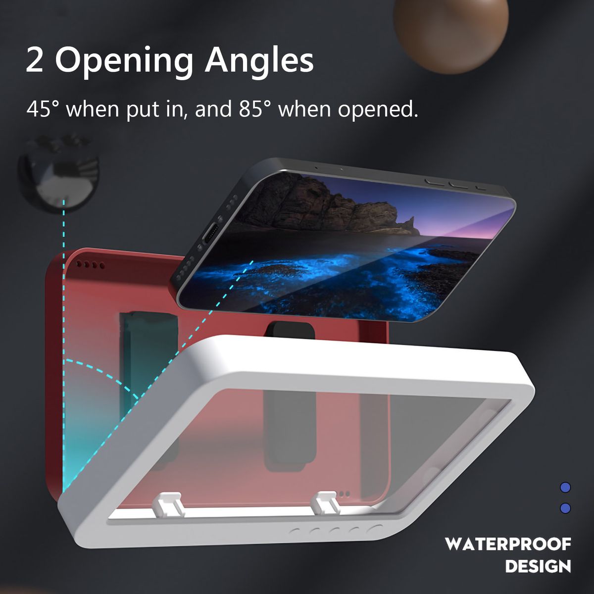 The wall-mounted mobile phone holder is the best choice for you to enjoy music or watch videos in the shower. Our shower phone holder is suitable for all mobile phones smaller than 7 inches in size. 2 opening angles, 45 deg; when put in, and 85 deg; when opened.