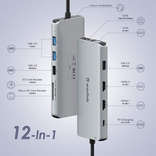 Wavlink Usb C 12-in-1 Hub Docking Station With 87w Power Delivery - Triple Displays Usb 3.1 Gen 1