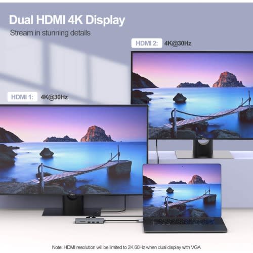 Dual HDMI Display - USB 3.0 or USB C to Dual HDMI Adapter connects back to the host, supports two HDMI monitors that can be extended or mirrored display. One HDMI port resolutions up to 3840x2160 4k@30Hz, another HDMI port up to 1920x1080 2k@60Hz output.Multiple Monitors Supported - on Windows, connect multiple USB adapters can be added to connect up to 8 monitors. On mac OS, connect multiple USB adapters can be added to connect up to 6 monitors. Note - driver installation is required.2 in 1 Multi USB to HDMI Universal Compatibility - Has USB 3.0 or USB C cable port match most computer, easily connect to USB-C or USB 3.0, USB 4.0, Thunderbolt 3/4. Supports systems Microsoft windows 7/8/8.1/10 or higher, Mac OS 10.10x or Above, Chrome OS, Android 7.1 Above. Get the best results, recommended for the web and productivity apps-like Google Docs or Windows Office.Powerful Chip & Extend/Mirror Mode - GPU with built-in "Content Adaptive Technology" reduces CPU load by up to 70% and multiple hardware decoders provide faster video streaming performance, equivalent to an external graphics card providing smooth HD video for your HDTV/projector/display. Extend mode 'ABC' allows you to view multiple tasks at the same time; Mirror mode 'AAA' can display the laptop on a large screen for visual enjoyment.