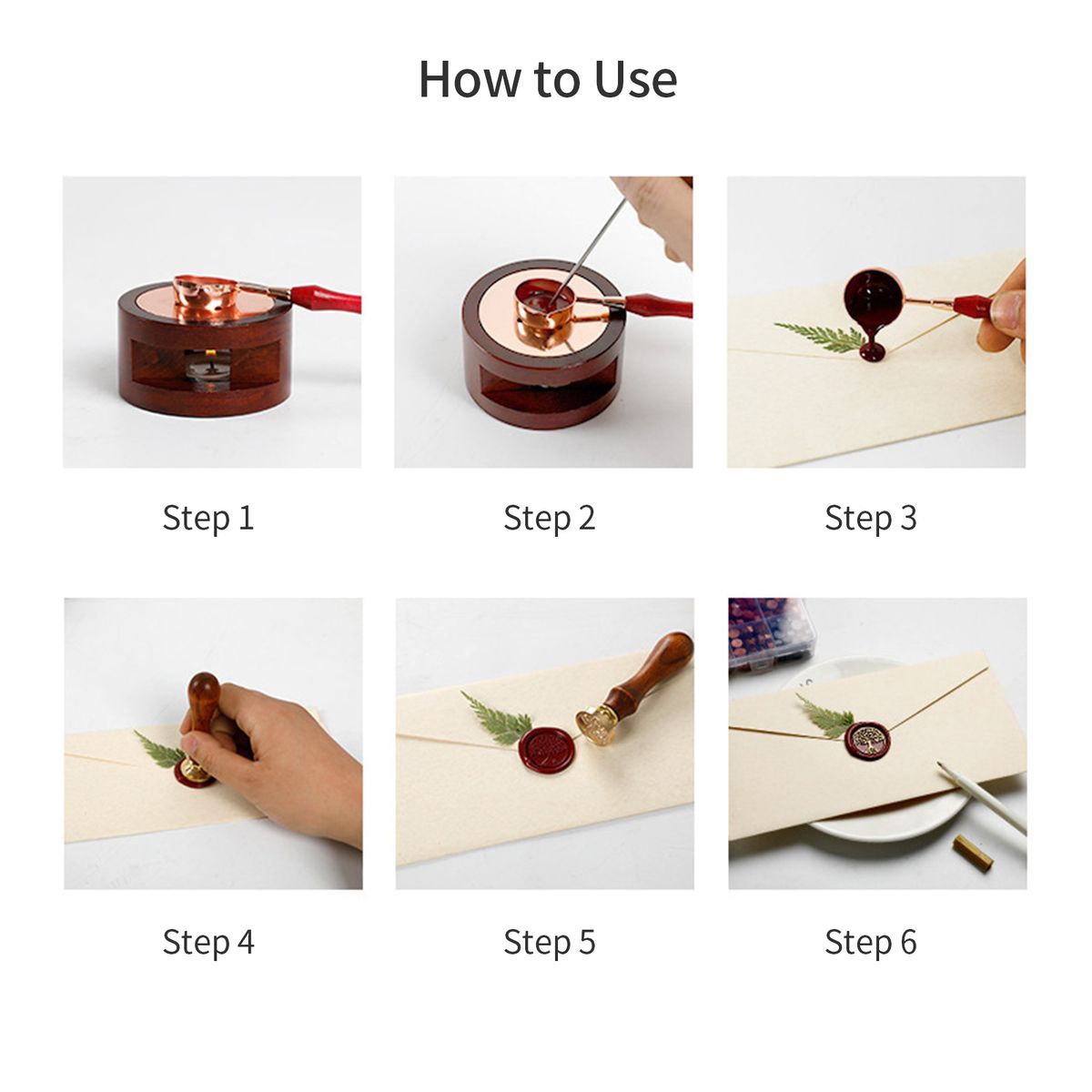 Take out a few seal wax beads and put them in a spoon, then put them on a lighted candle for heating, pour the melted wax into the required position, and then stamp it with a seal.(Note: The seal is not included.)