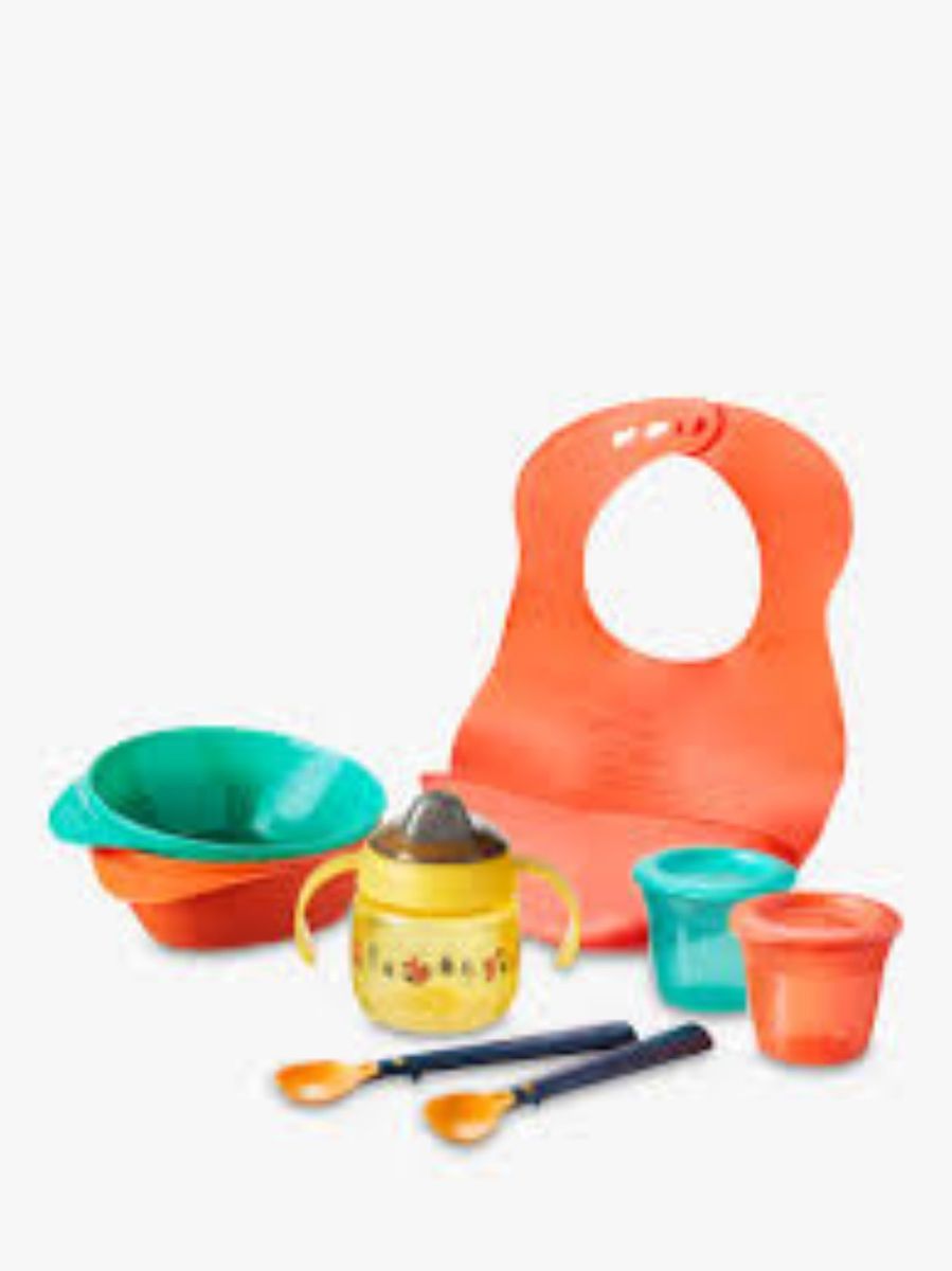 contains: 2x feeding bowls, 2x wide-scoop feeding spoons, 2x food storage pots, 1x n-spill sippee cup with handles, 1x wipe clean bib