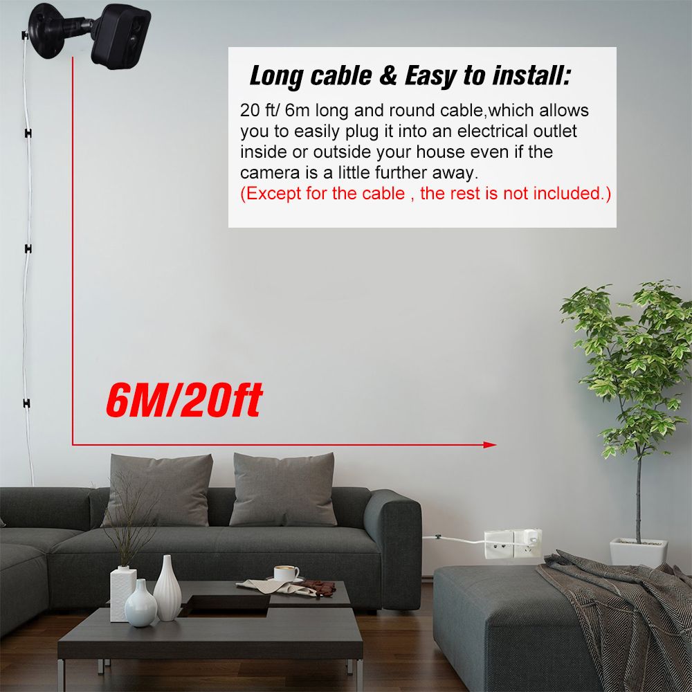 *6m/20ft for length,which allows you to easily plug it into an electrical outlet inside or outside your house even if the camera is a little further away,very convenient and practical for your daily use.