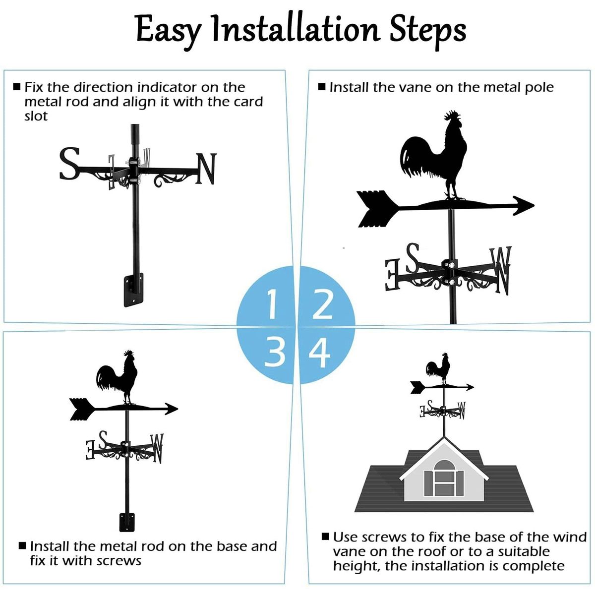 Detailed Information About The Product:Rooster Metal Weathervane: This beautiful weather vane has been masterfully crafted from metal and varnished to add long-lasting color and dimension to your backyard. Our weathervane is not only beautiful, but also useful to know which direction the wind is going.
