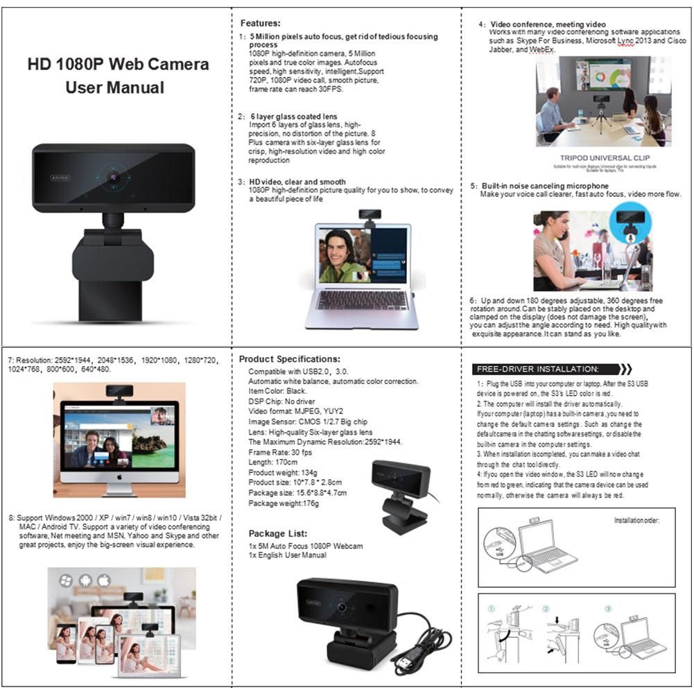 Features: 1.Built-inindependentdigitalmicrophonechannel,youcanclearlyhearthesoundwithin10meters. 2.Canbendandstandatwill. 3.1080PHDcamera,2millionpixelsandtruecolorimages. 4.Theupperandlower30degreescanbeadjusted,thegimbalrotates360degrees,andtheangleofitcanbeadjustedasneeded. 5.edopticalglalenswithhighprecisionandnodistortionofthepicture. 6.Thefixedfocallengthof60cm/23.62in(about)isfixed,andthelensofitcanberotatedfreelyforadjustment. 7.DesignedforAndroidTVonlaptopsanddesktops. 8.CompatiblewithUSB2.0. 9.Automaticbalance,automaticcolorcorrection. 10,Resolution:1920*1080/1280*720/960*720/800*600;/640*480etc. 11.SuitableforWindows2000,forXP,forwin7,forwin8,forwin10,forVista32bit,forMAC,forAndroidTV. Specifications: DSP:nodriver Imager:CMOS Lens:high-qualityfive-layerglalens HD:5megapixels Maximumdynamicresolution:1920*1080 Framerate:30fps Colour:black Weight:about380g Packingsize:about15.5*8.6*4.5cm/6.10*3.39*1.77in Freedriverinstallation: 1.PlugtheUSBintoacomputerorlaptop. 2.Thecomputerwillautomaticallyinstallthedriver. 3.Artheinstallationiscomplete,youcandirectlybeginthevideochatbyusingtherelatedsoftware. 4:Ifthevideowindowisopened,theS2LEDwillbeblue,indicatingthatthecameradeviceisworkingnormally. PackingList: 1*Camera 1*Cable 1*Manual Note: