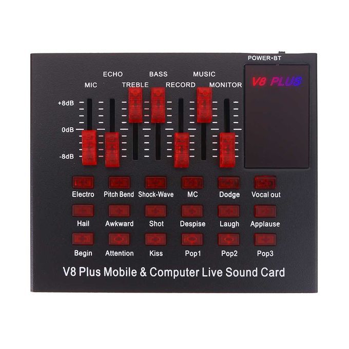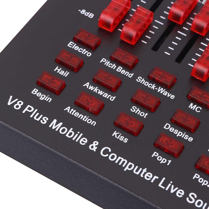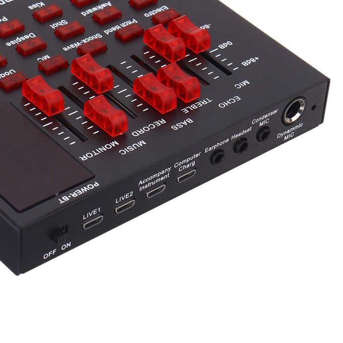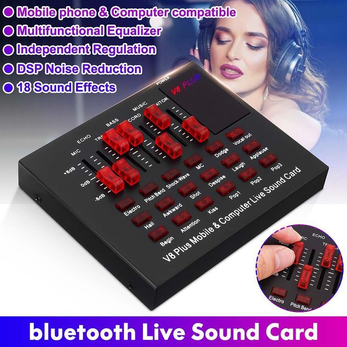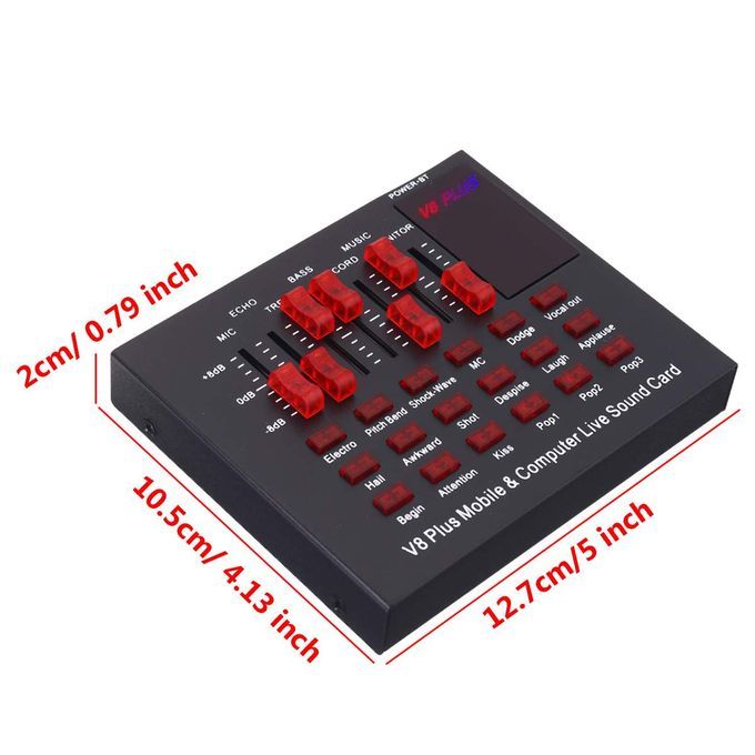 Features:Function: 18 Sound Effects, Multifunctional Equalizer, DSP Noise Reduction.Independent Regulation, Mobile phone & Computer compatible.Dual channel, external installation, Microphone input.Universal Design: Universal for most devices, such as mobile phone , computer, PC, etc..Housing Material: Made of metal material, durable and not easy to break.Applicable Usage: Suitable for home, office, studio, stage, Karaoke and so on.18 kinds of electronic sounds ?Applanse, Interest, A-tune, Hush, Kiss, laughter, Awkward, Apit, etc.With a headset you are a professional anchor, no need to use a microphone, gain more fans.2 Live port, 1 condenser mic port, 1 dynamic port, 1 Accompany instrument port, 1 earphone port, 1 headset port, 1 computer portMini and compact, easy to use and carry.
