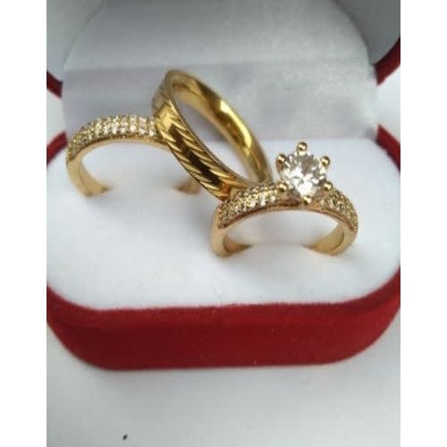 Look super stunning in this exquisite wedding couple's ring set made of the most exotic of gold. It is adorned with Beautiful etchings to make it masterfully crafted piece of art.Sparkling and beautiful stainless steel wedding/engagement ring set for the lovely couple.It is adorable and completes the occasion of a lifetime memory.