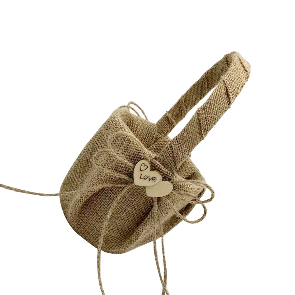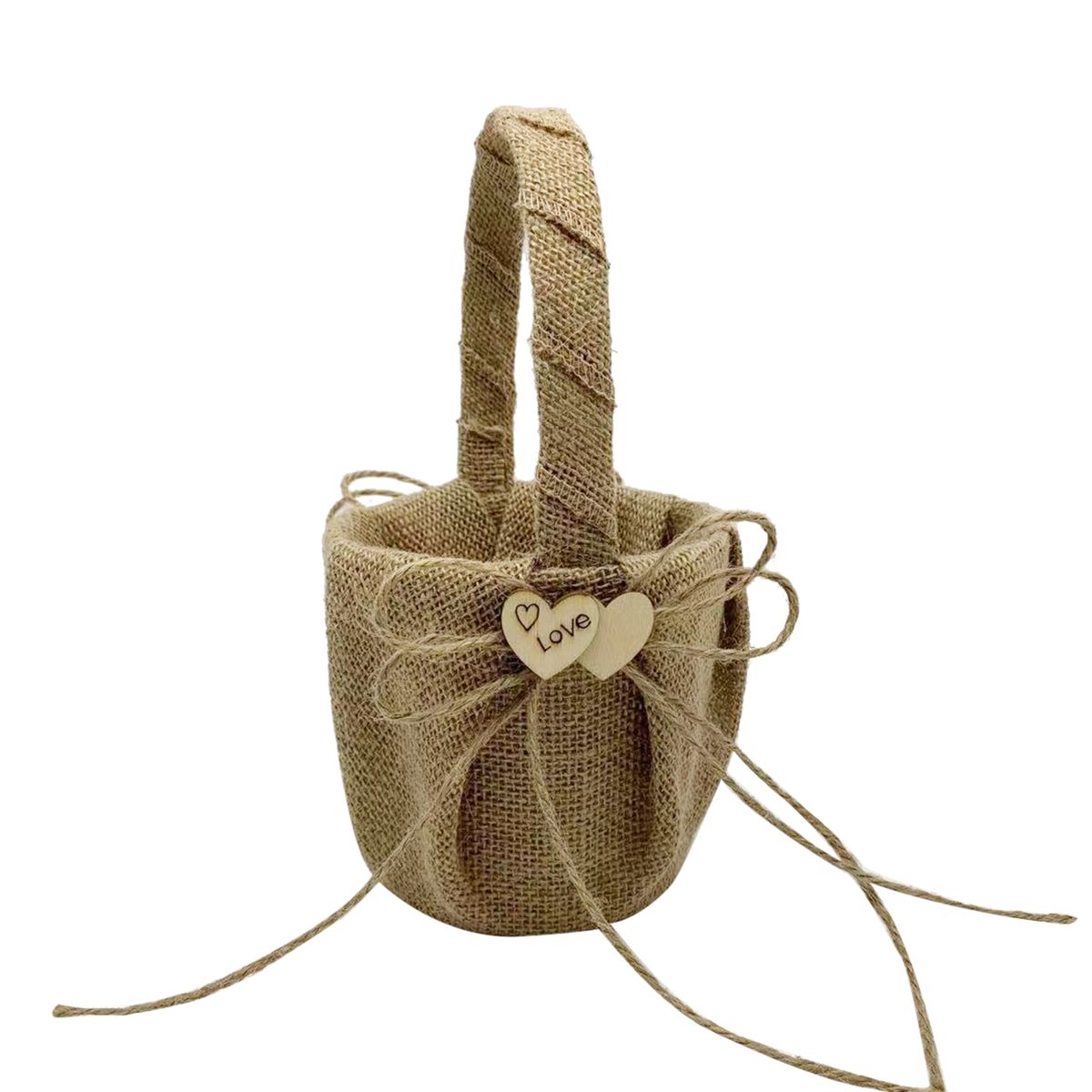 Wedding flower basket with bowknot and double wood heart decoration, very cute and stylish.