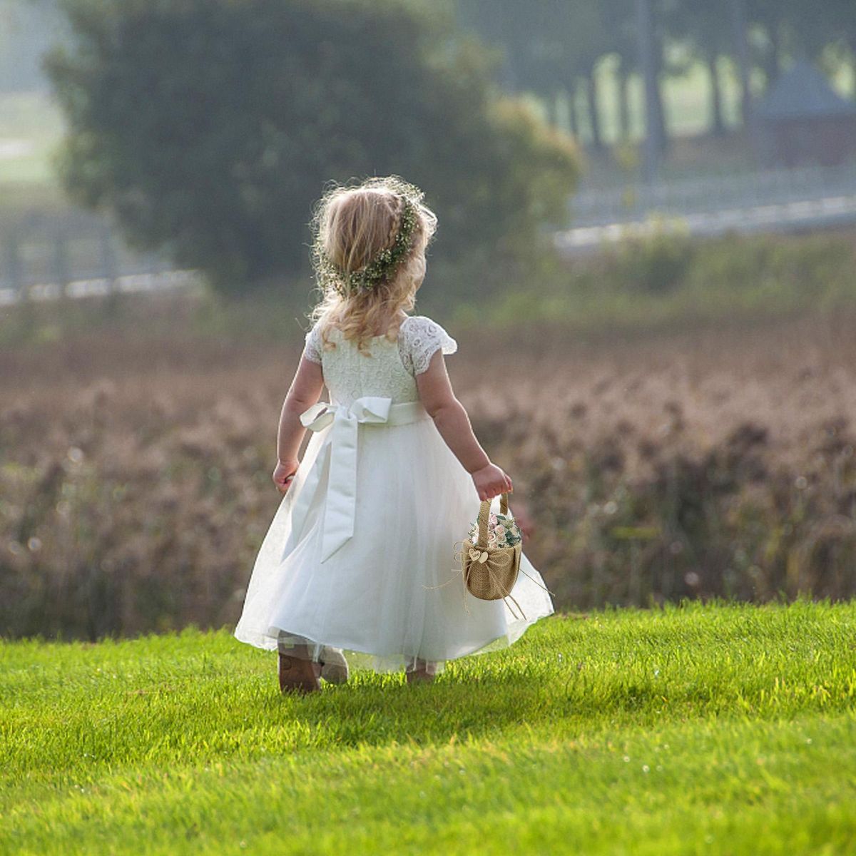 Buy Wedding Flower Girl Basket Vintage Rustic Style Bowknot Double Wood Heart Design Burlap Hessian Wedding Flower Basket in Nigeria