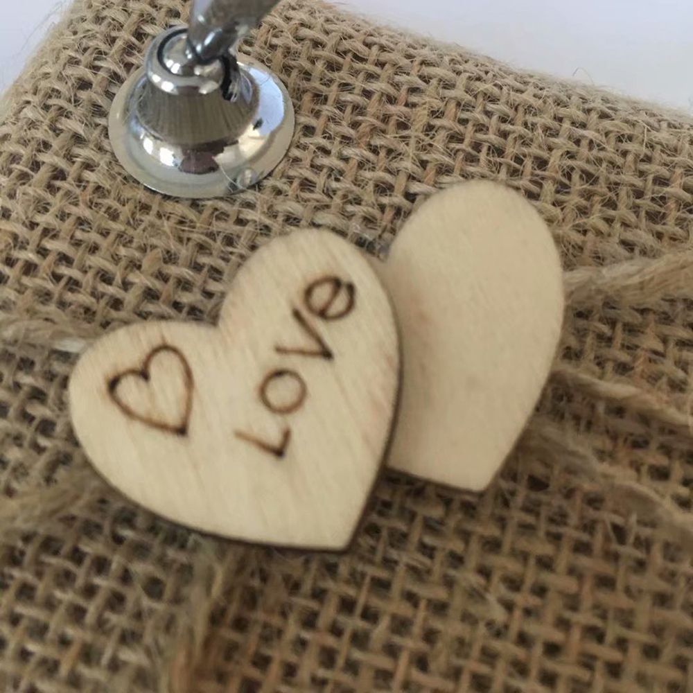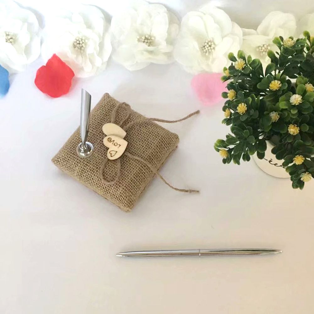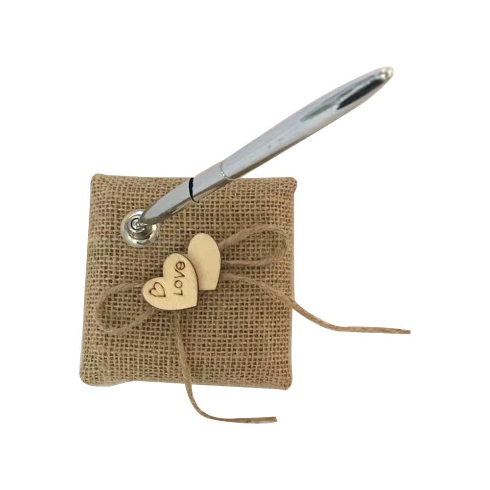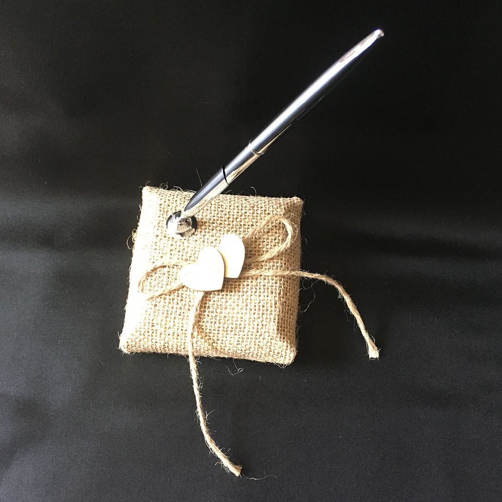 The ball-point pen(black ink) and vintage burlap Pen Holder with Stand Wooden Hearts.