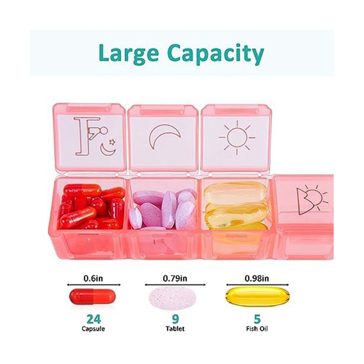 Capacity - Spacious and practical! Each compartment in our weekly pill box can store 6 fish oils, 9 vitamins, or 24 #3 capsules for your