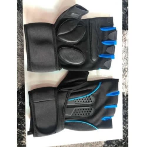 Weight lifting gym gloves in black and blue color combination, with firm grip made from cotton and leather/rubber materials for cushioning, one size fits all with wrist adjustable strap and plaster. written XL. Restocked