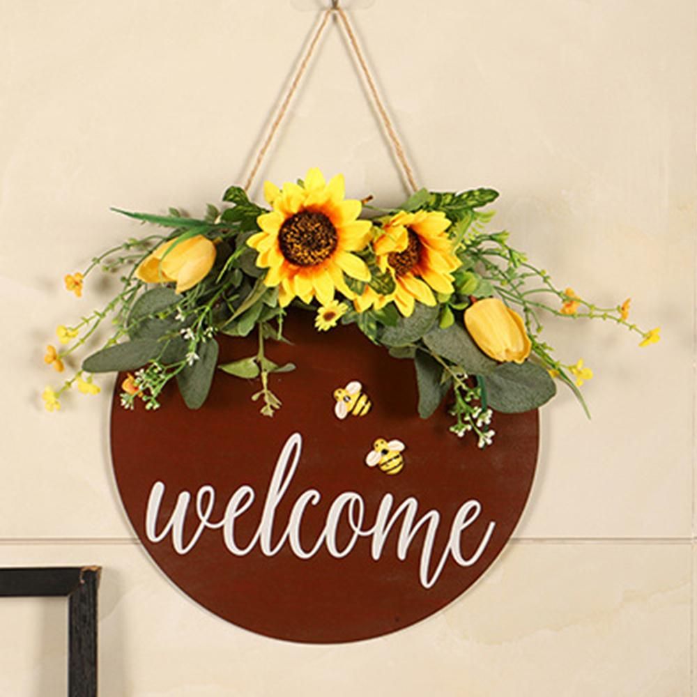 EASY TO HANG - welcome sign includes a jute rope to easily hang it on your front door decorations or porch. The rope is strongly secured on the wood with metal. It features the word "Welcome" written in a beautiful and cursive font. It was printed with a silk screen technology and will not fade under the sun. It has a fabric bow, flowers and green leaves to complete the rustic look. The round sign was made of 100% paulownia wood. It will not break, will not crack and will not bend.